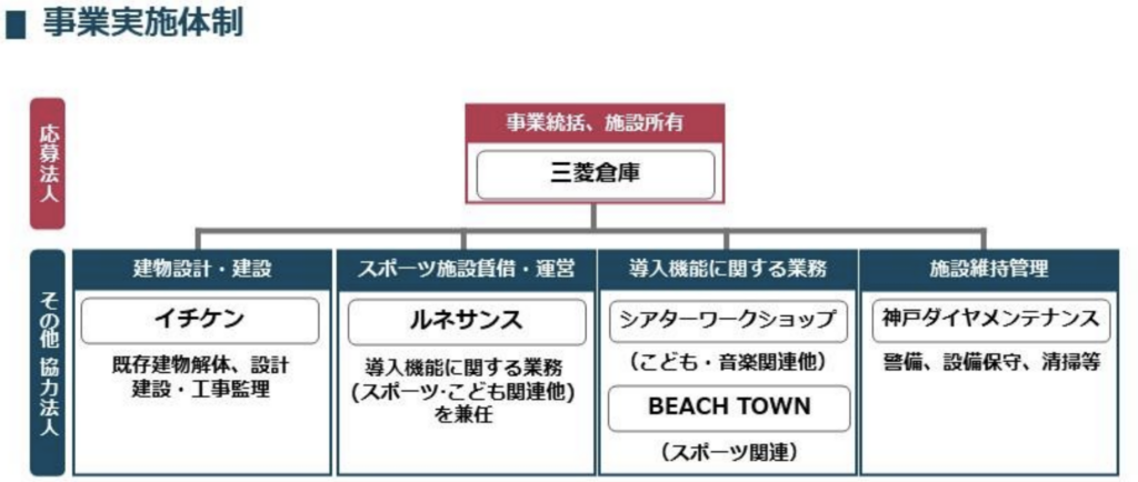 運営においては、ルネサンス(スポーツ)、イチケン(建設)、シアターワークショップ(こども・芸術関連企画)、BEACH TOWN(スポーツ関連)、四国サンメンテナンス(施設管理)など、複数の事業者が参画する体制を採用しています。