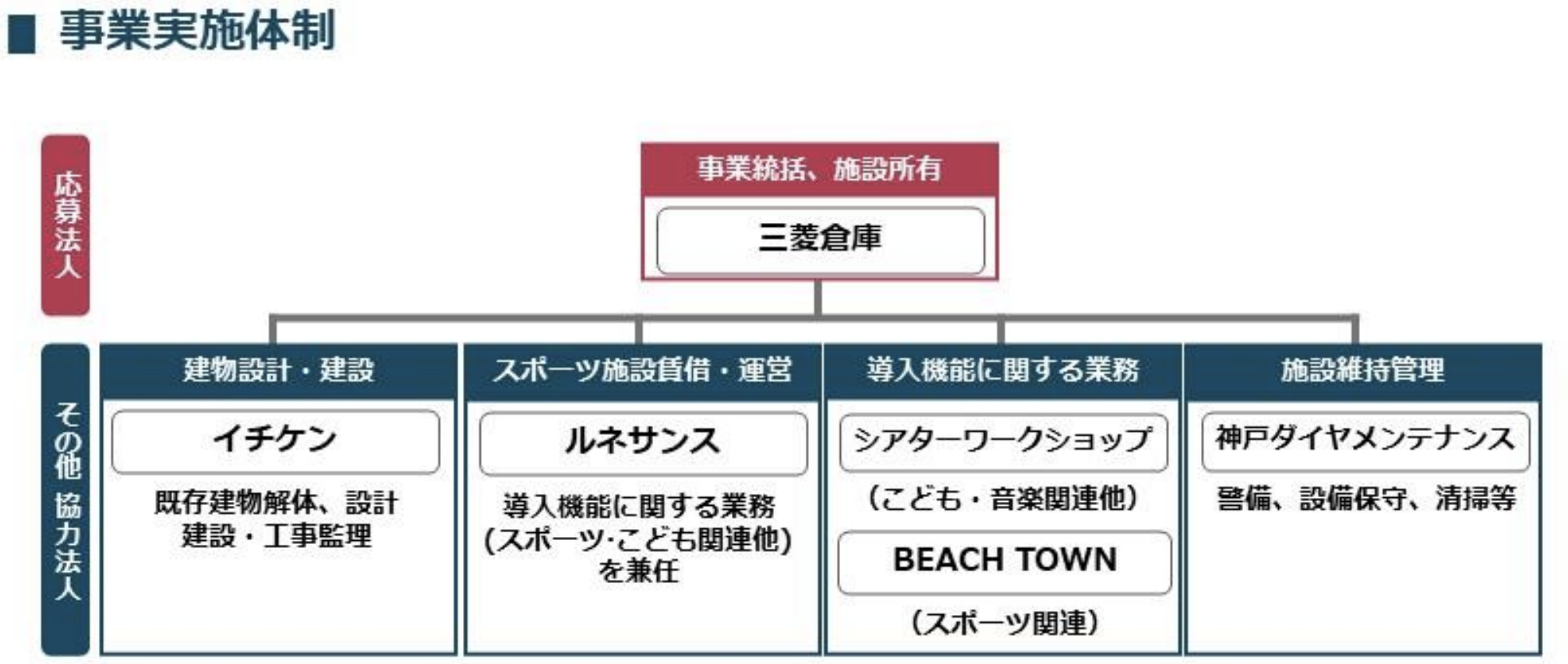 三菱倉庫を事業主体とし、建設や運営は専門事業者が担う分業型の体制を採用しています。