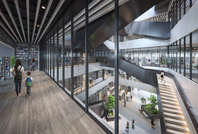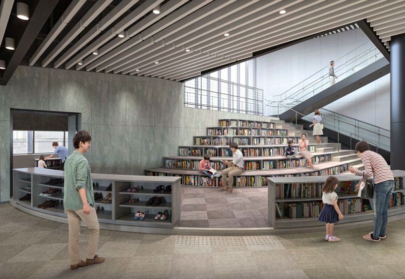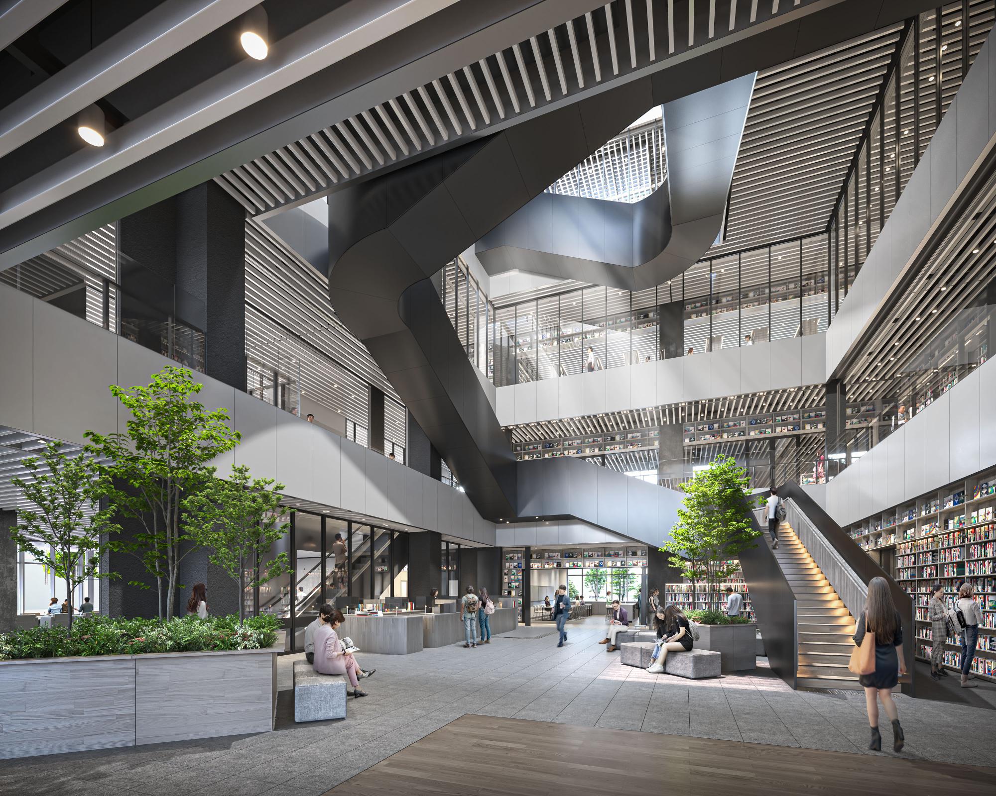 孔空き金属パネルにより、日射・通風・視線配慮を同時に実現。読書環境に配慮しつつ、駅前の新しいランドマーク性を高めています。
