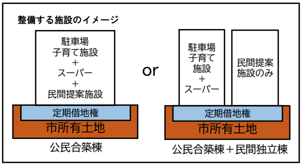 事業方式は定期借地権方式が想定されており、市は土地を保有したまま民間事業者が施設の整備と運営を担います。