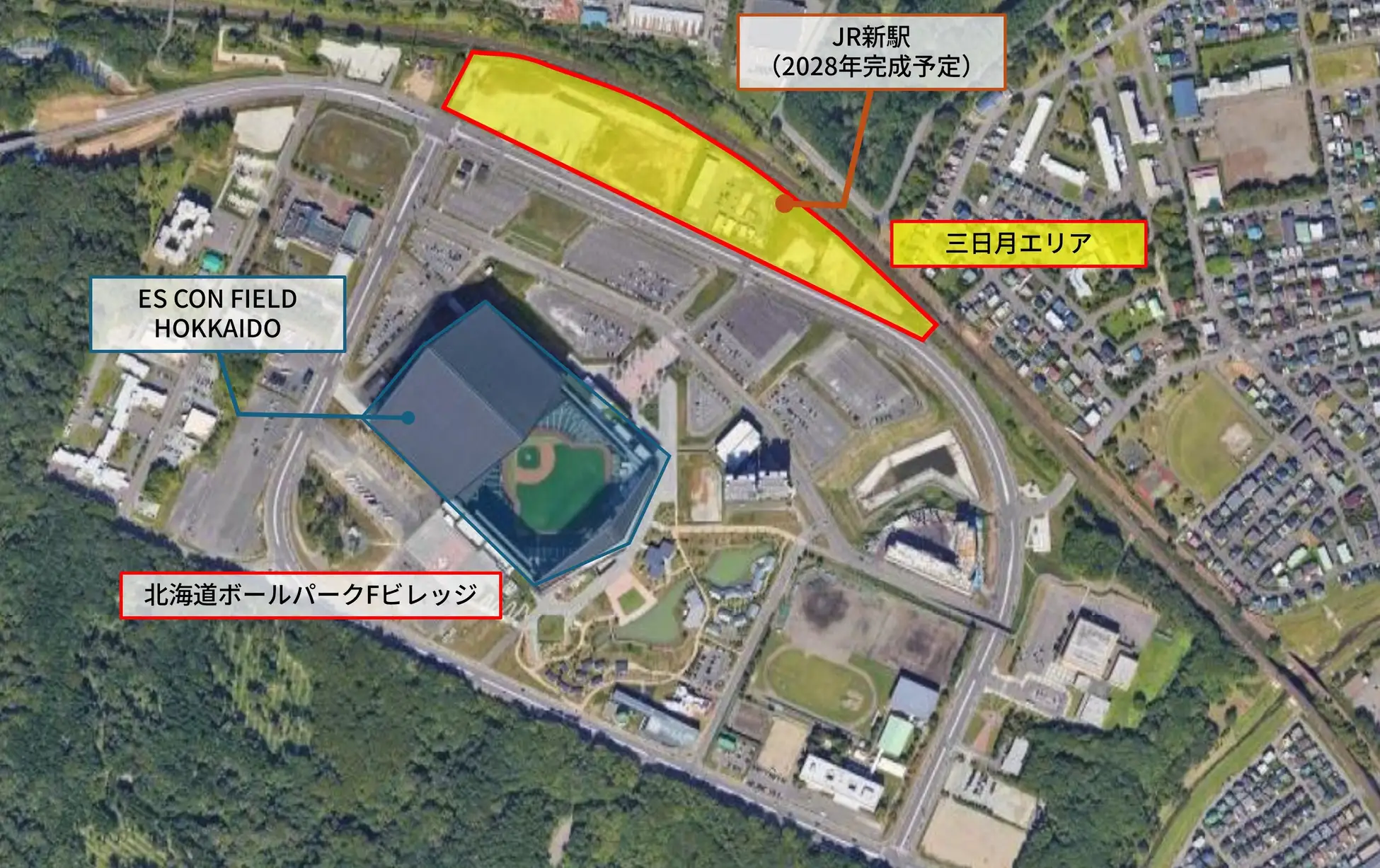 建設地は、北海道ボールパークFビレッジと、2028年夏頃に開業予定のJR千歳線新駅「(仮称)北海道ボールパーク駅」に近接する「三日月エリア」です。新駅からは徒歩3分程度とされ、球場へも徒歩圏内に位置します。