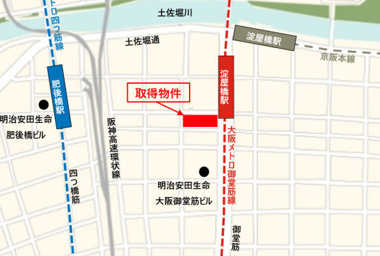 取得したヒューリック大阪ビルは、大阪都心を南北に貫く御堂筋沿いに位置し、大阪メトロ御堂筋線および京阪本線の淀屋橋駅と直結する、利便性の高い立地にあります。