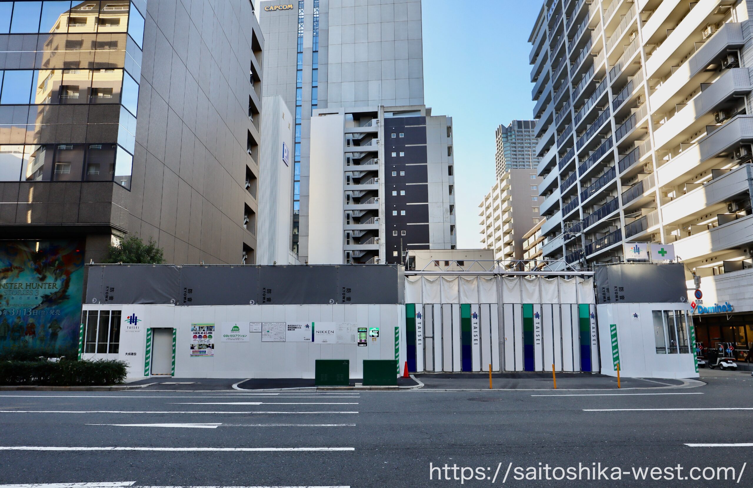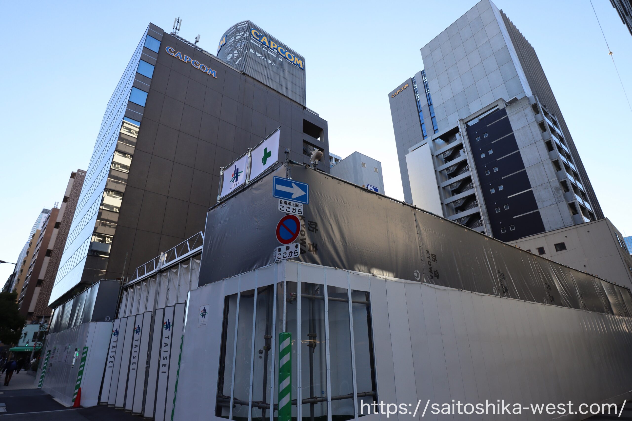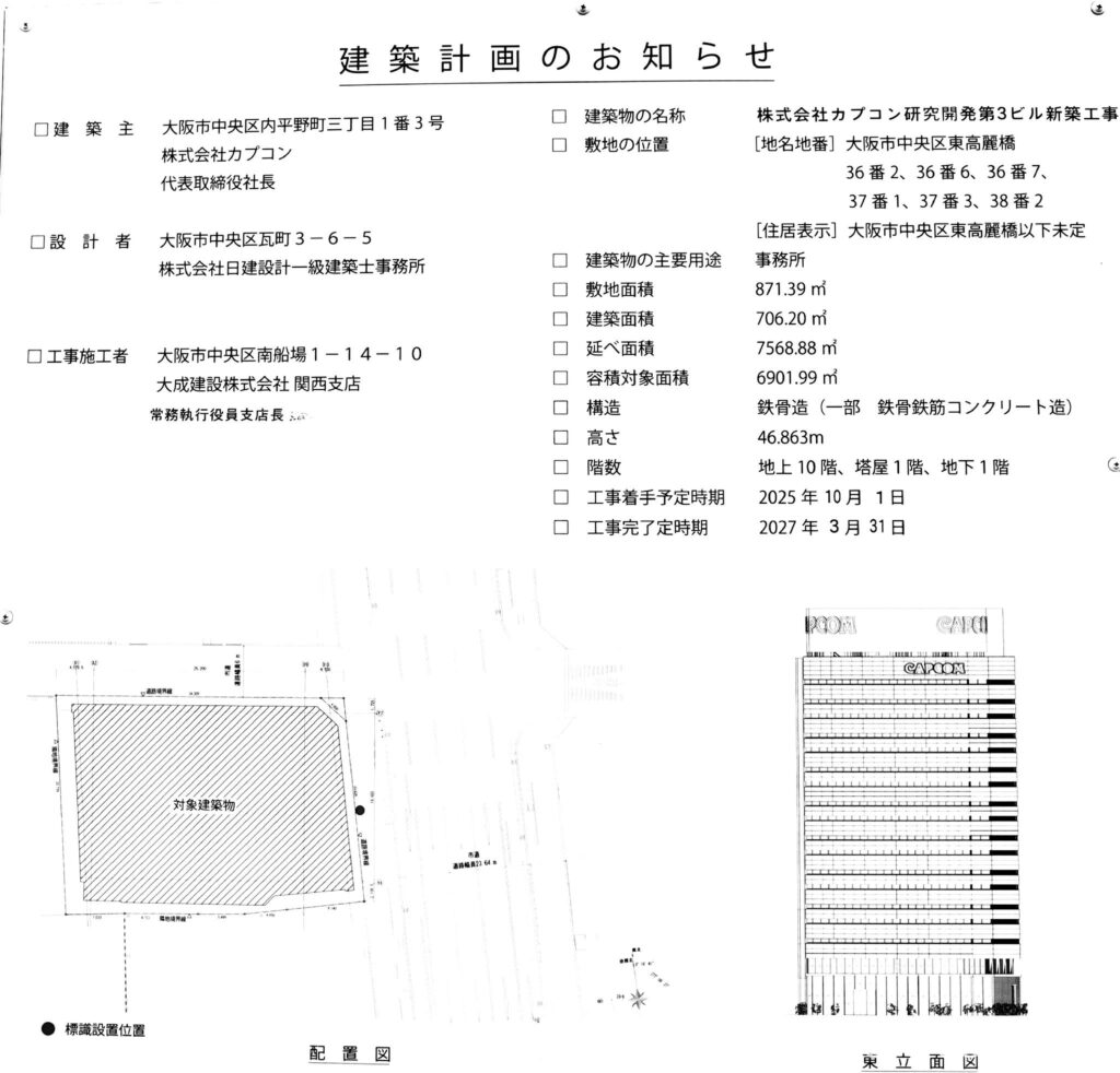 カプコン研究開発第3ビル新築工事は、大阪市中央区東高麗橋に建設中のオフィスビルです。新ビルの規模は地上10階、高さ46.863m、敷地面積871.39㎡、建築面積706.20㎡、延床面積7,568.88㎡。建築主は株式会社カプコン、設計は日建設計、施工は大成建設が担当しています。2025年10月に着工し、2027年3月に竣工する予定です。