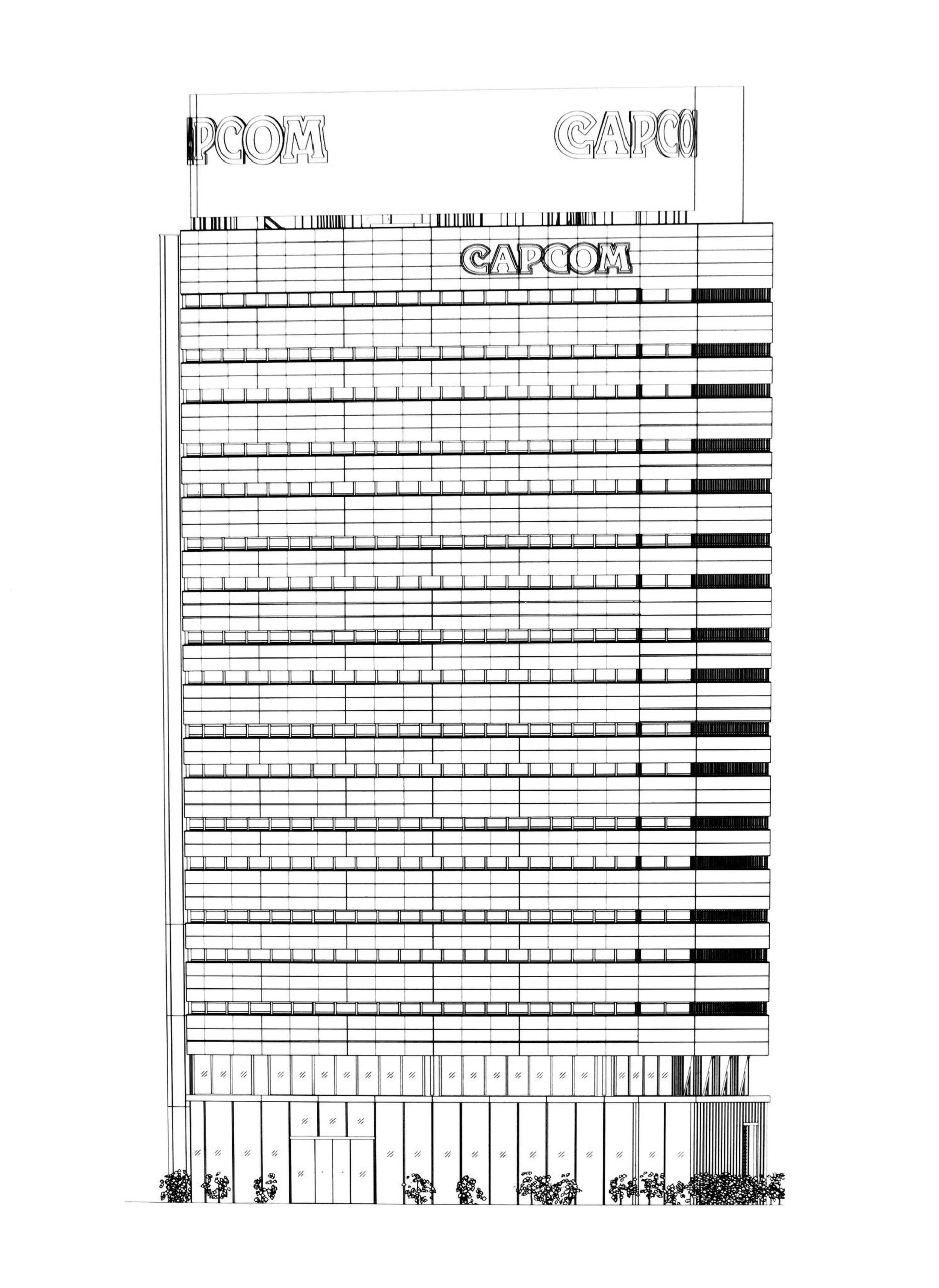 真正面、東側から見た様子です。カプコンの研究開発機能は、すべて本社隣接地に集約されています。