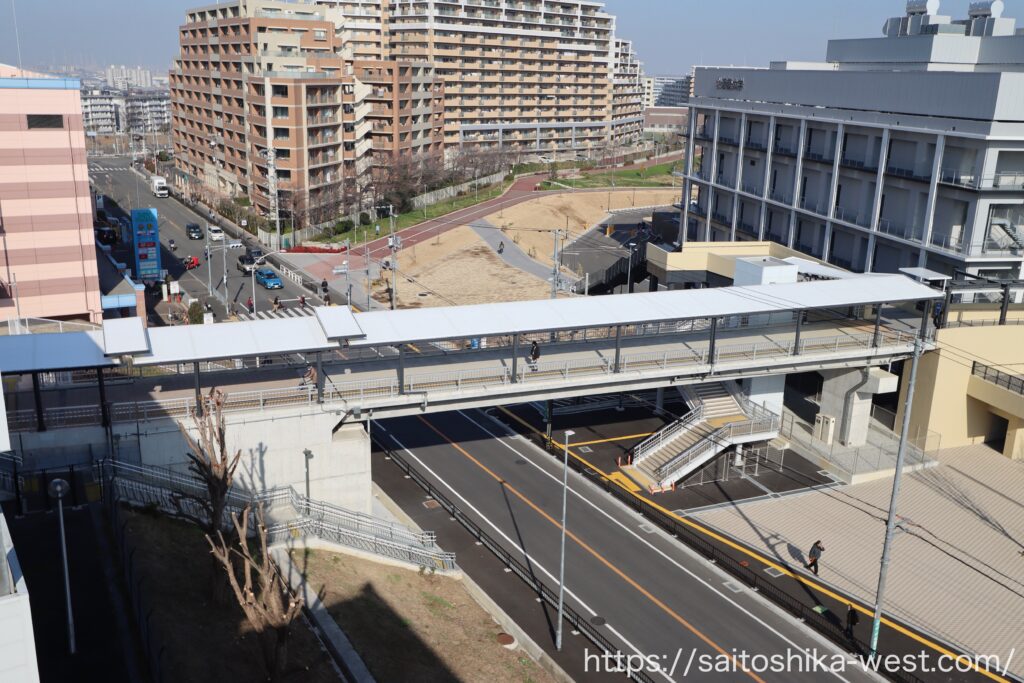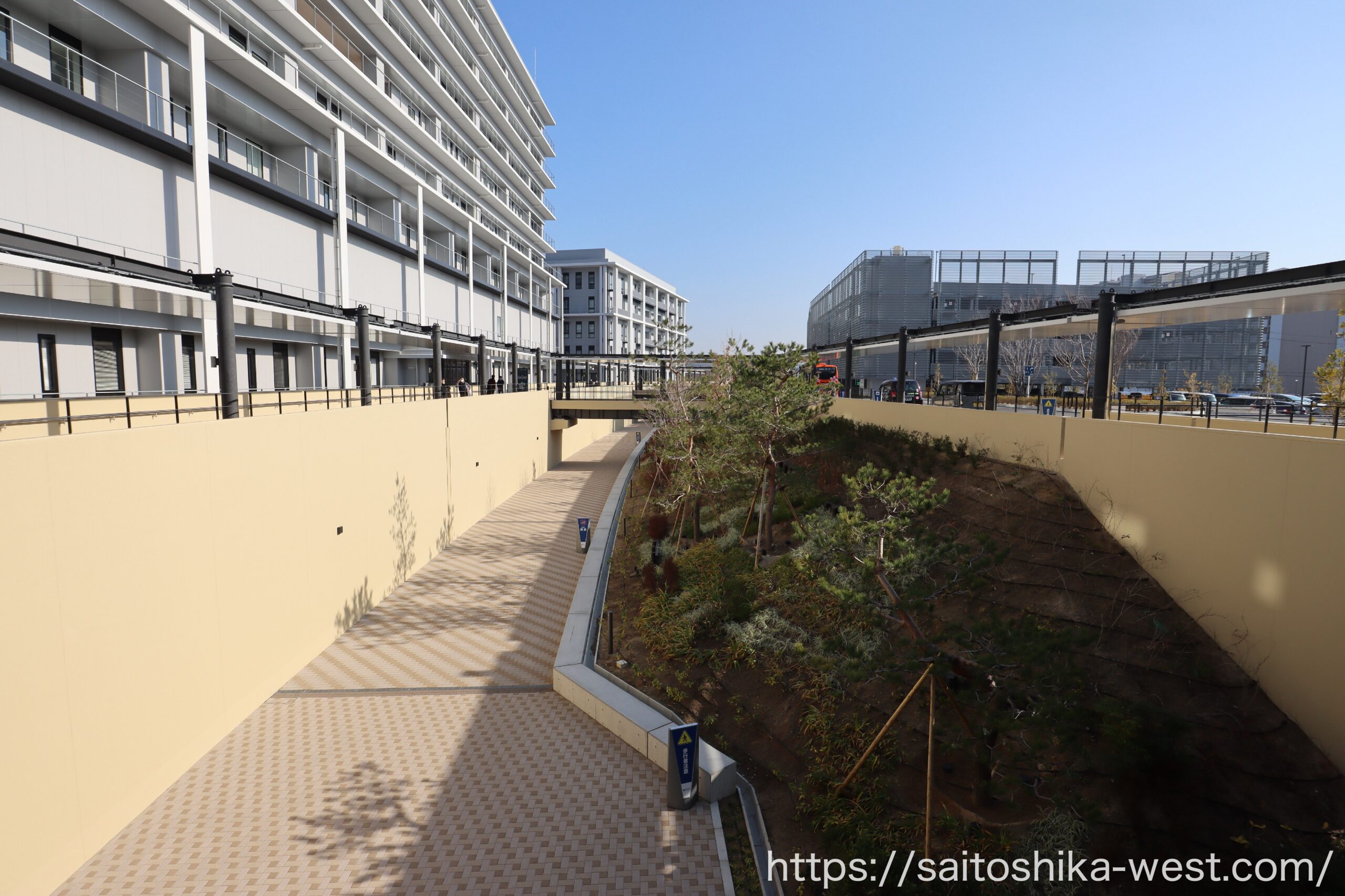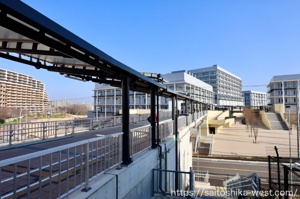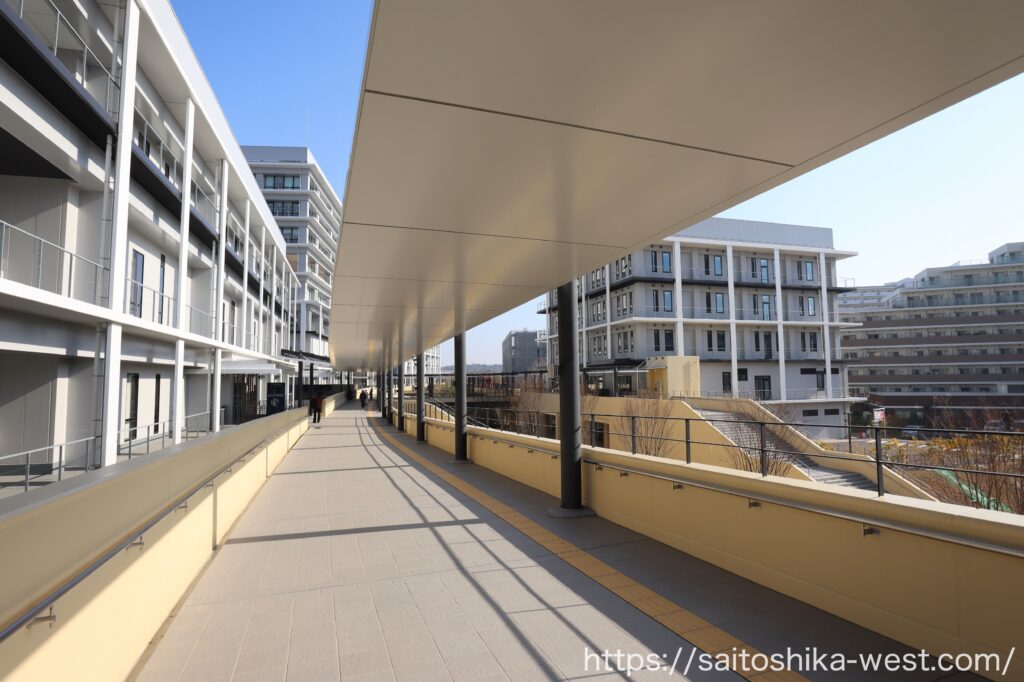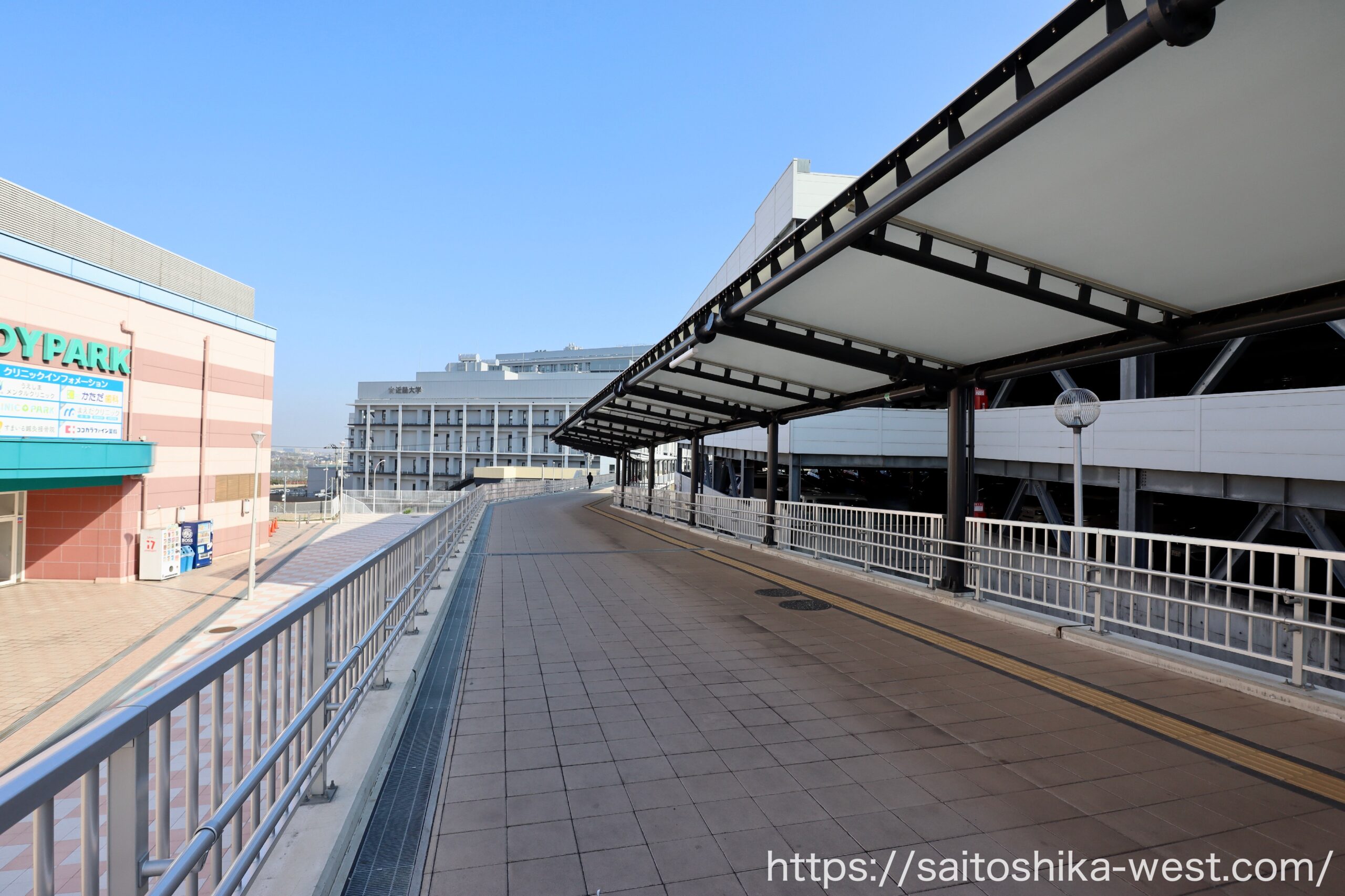 泉ヶ丘駅と接続するペデストリアンデッキです。屋根付きのため、雨天時でも利用しやすい動線となっています。