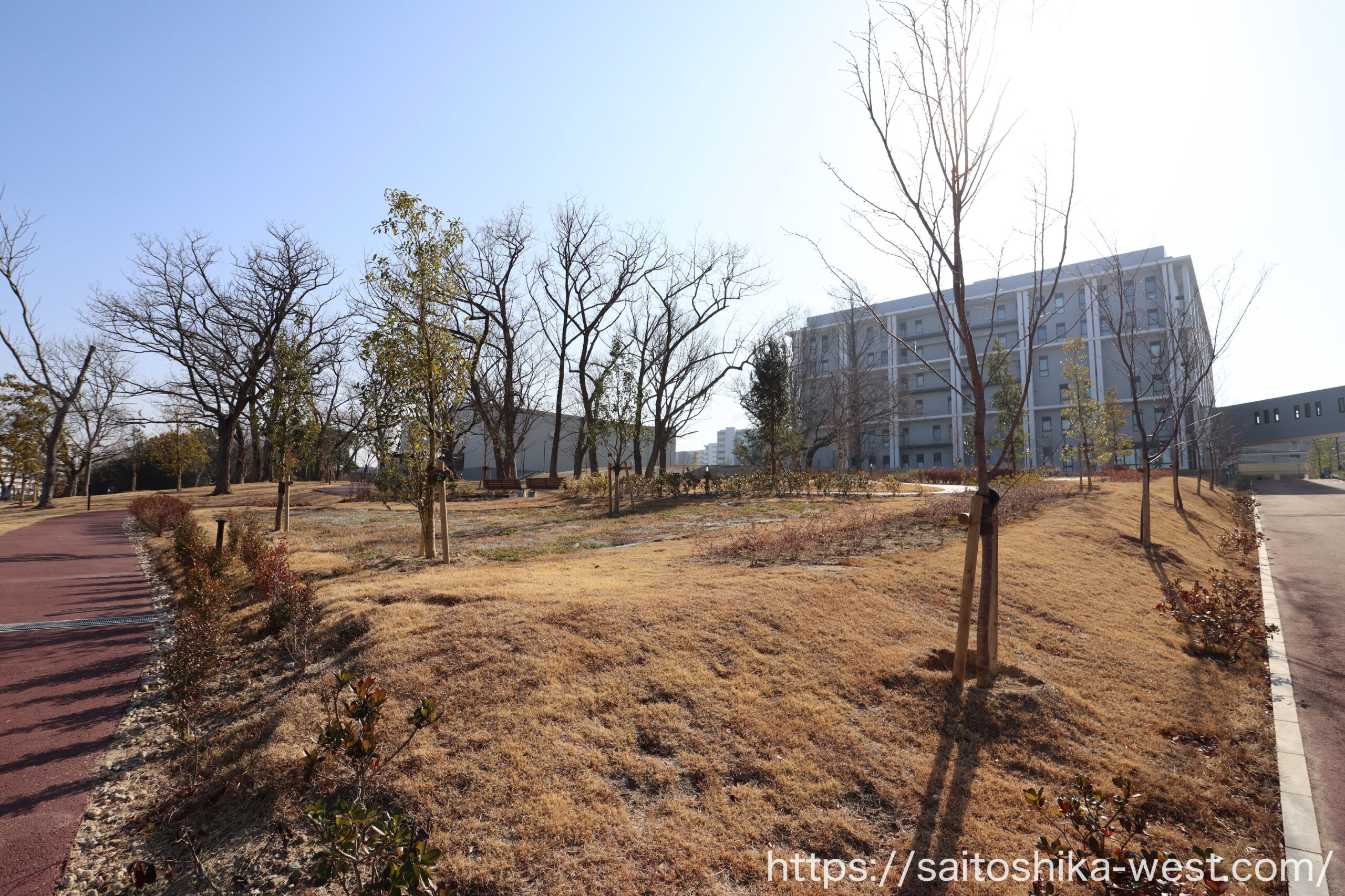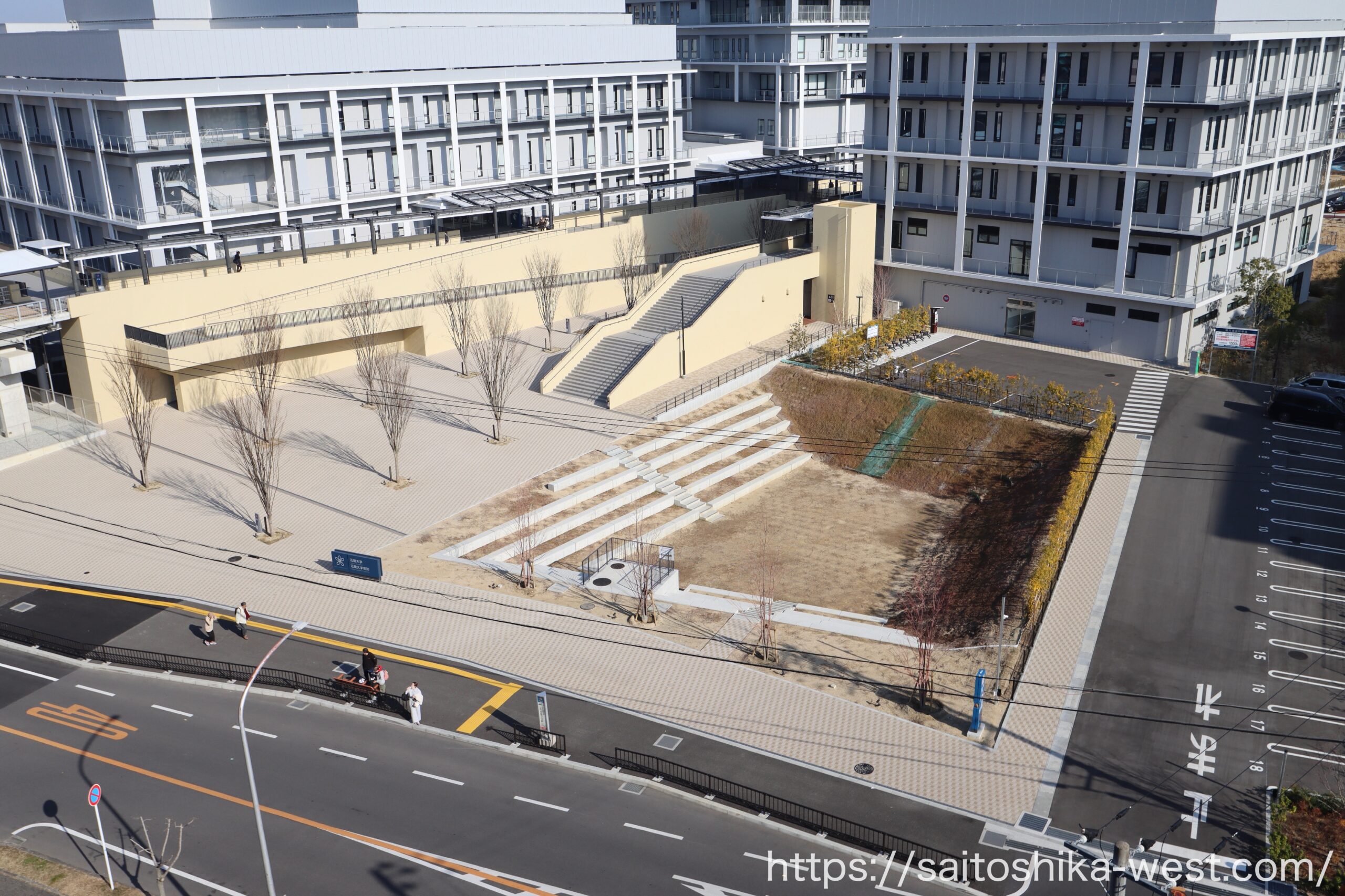 大きなオープンスペースが設けられています。階段状の部分は当初、調整池かと思っていましたが、実際には「集いの広場」と名付けられたイベントスペースのようです。