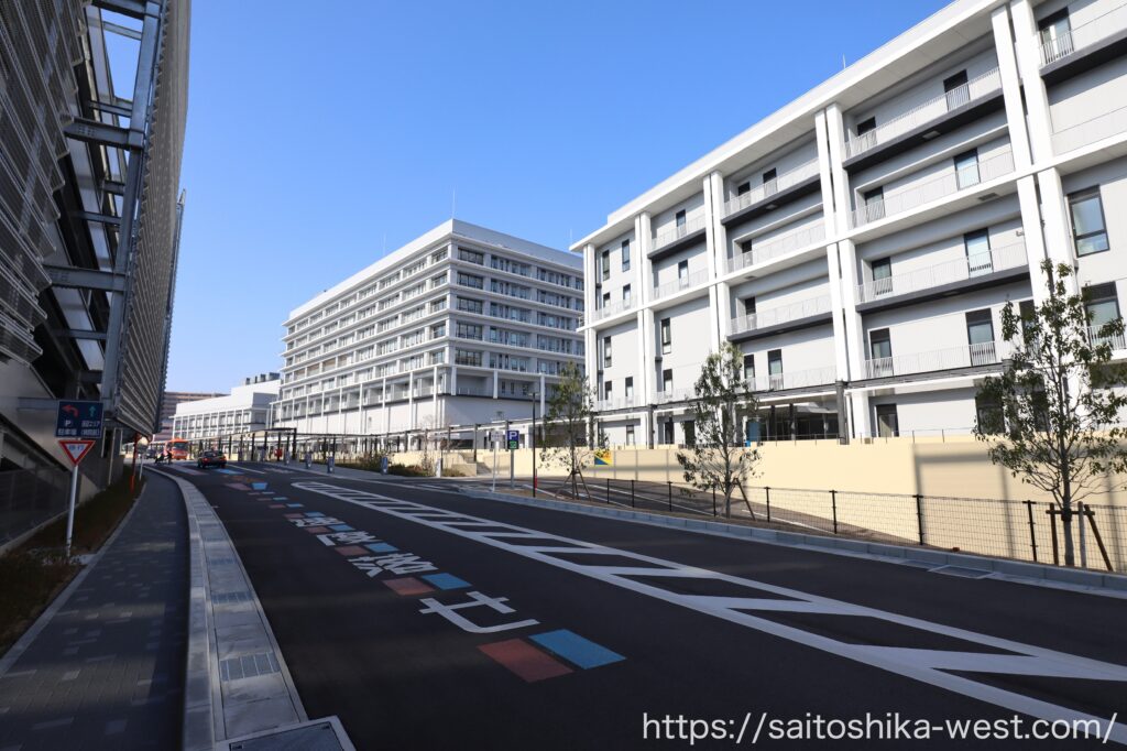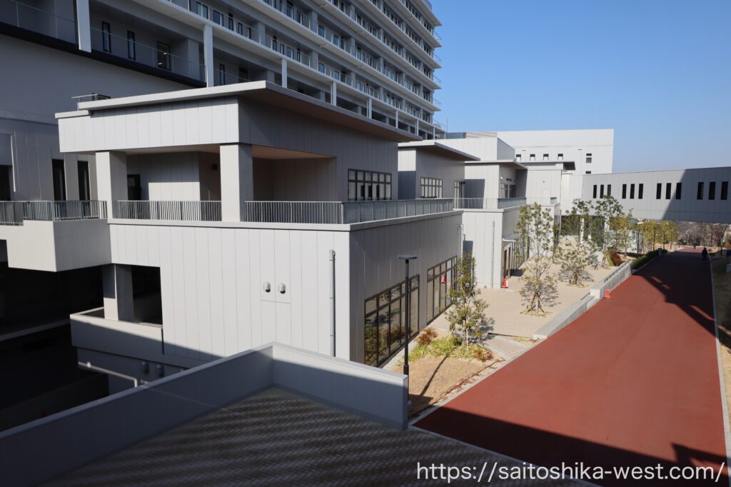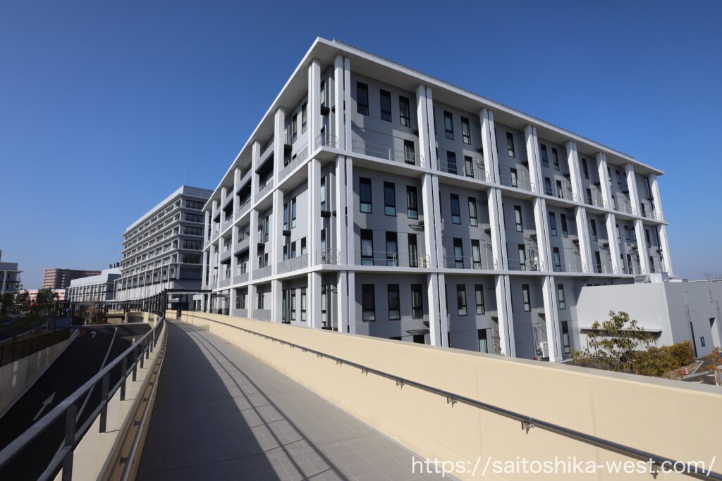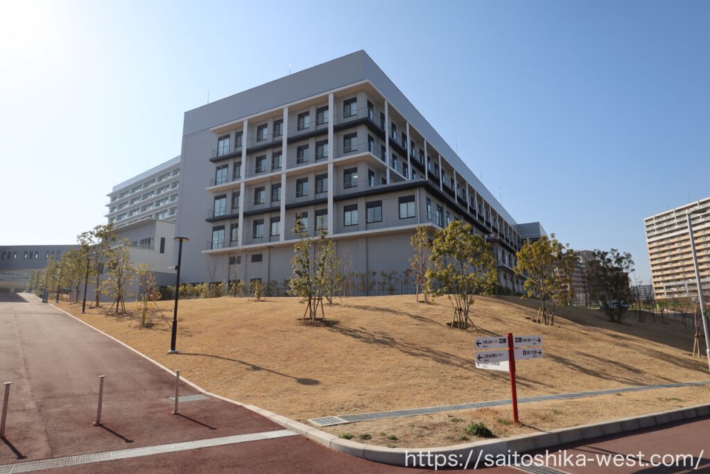 やっと一周できました!完成した近畿大学『おおさかメディカルキャンパス』は、広大な敷地をフェンスレスで周辺地域と接続する「ひらかれた設計」となっており、よく聞く理念を実際に実現させようとする近畿大学側の覚悟を感じ取ることができました。