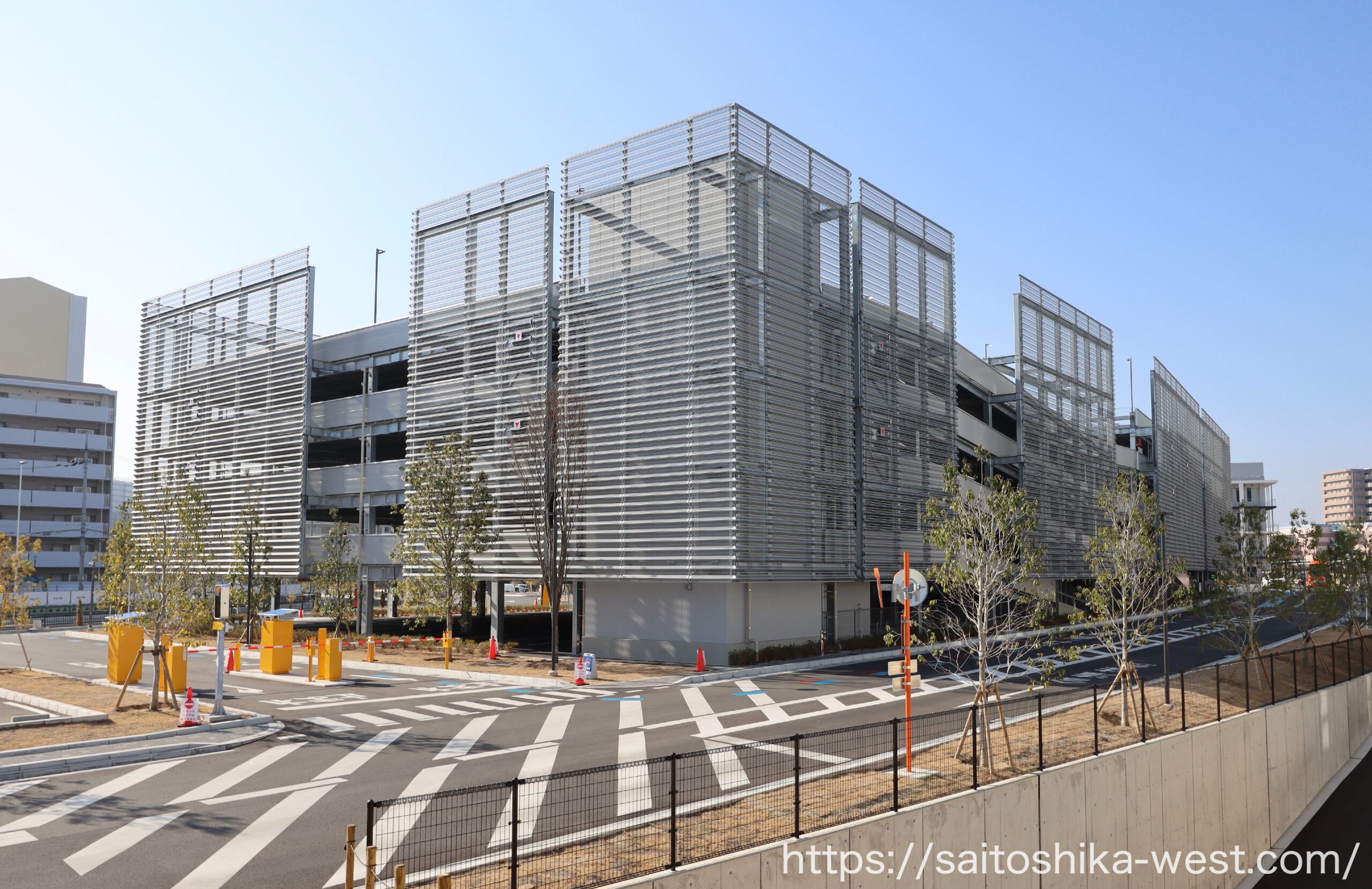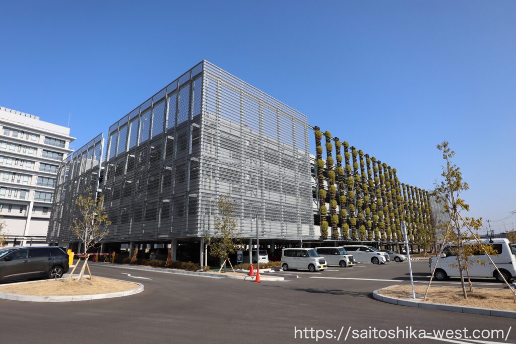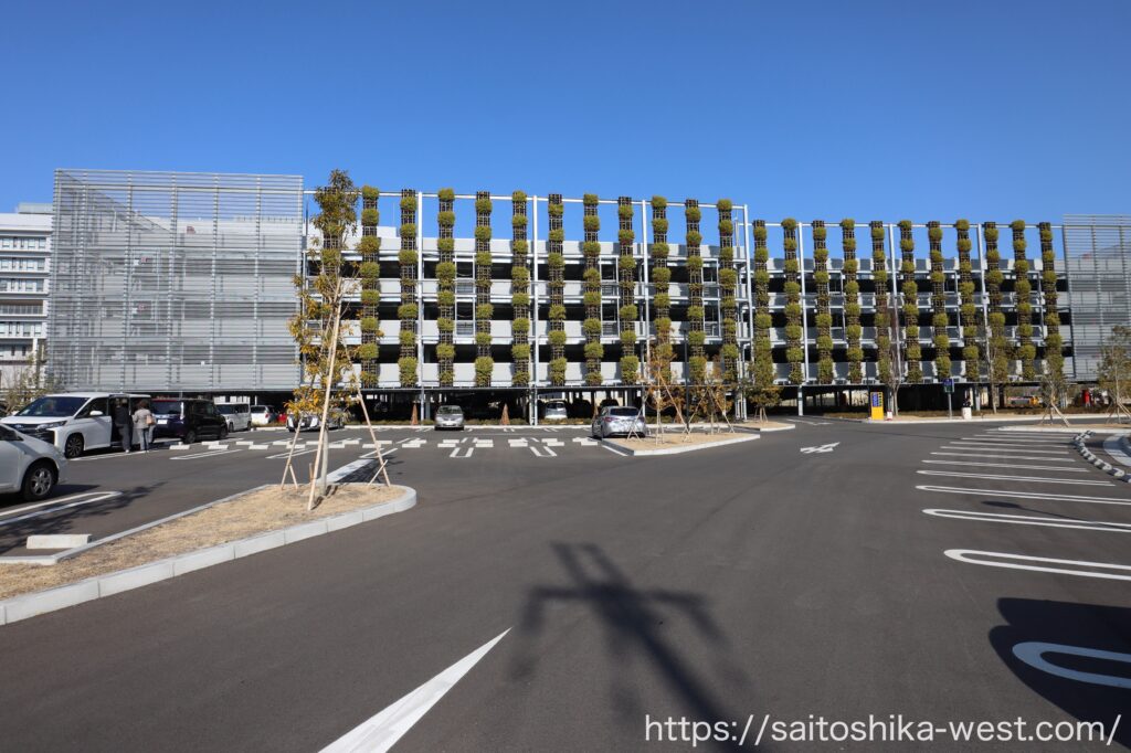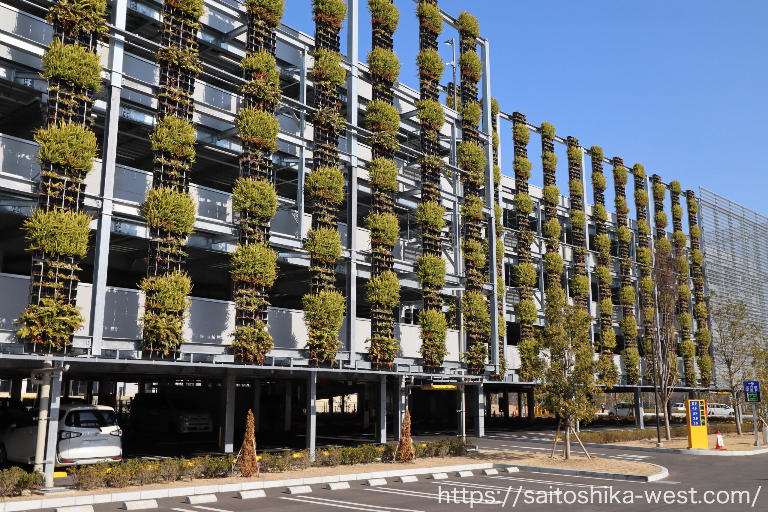 立体駐車場の様子です。周辺の団地やマンションに配慮し、大規模な壁面緑化が施されています。