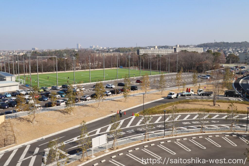 立体駐車場から見たグラウンドの様子です。ドクターヘリが着陸できる様です。