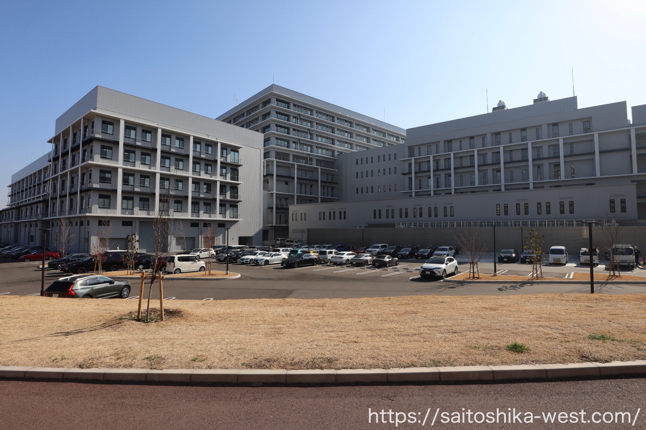 南側から見た様子です。写真手前が1号館(外来棟)、奥の大きな建物は2号館(診療棟)です。