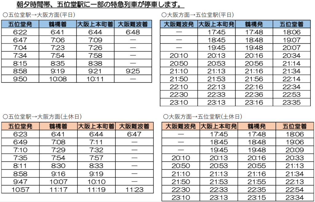 五位堂起点で鶴橋方面を見た場合、昼間時間帯に先着する列車は毎時3本から4本へ増加します。途中停車駅が3駅増加することで所要時間は伸びますが、待ち時間を含めた移動全体で見ると、(今後明らかになる五位堂〜鶴橋間の区間急行の所要時間にもよりますが)総合的な利便性は向上すると考えられます。