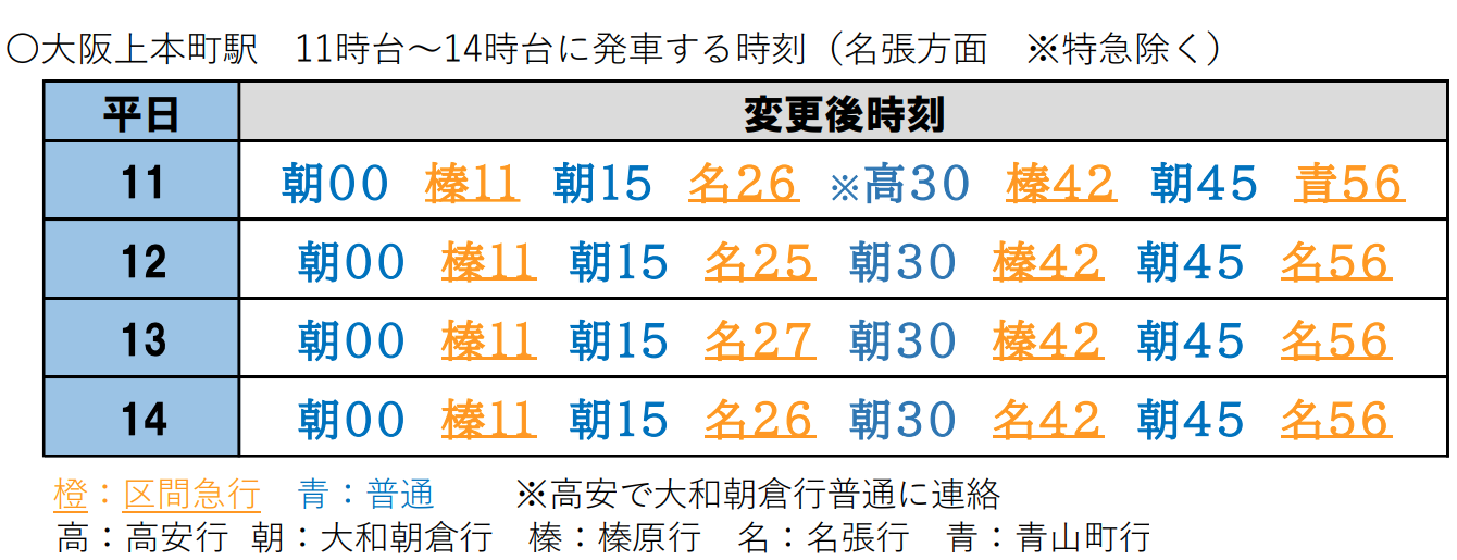 改正前は大阪上本町起点で、急行・区間準急・普通を合わせて毎時11本でしたが、改正後は毎時8本となり、日中は明確な減量ダイヤへ移行します。