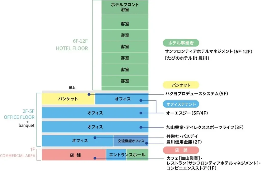 FRONTIS TOYOKAWAは、都市の急成長を狙う施設というより、駅前に必要な機能を集約し、拠点性を維持するための複合ビルとして位置付けられます。
