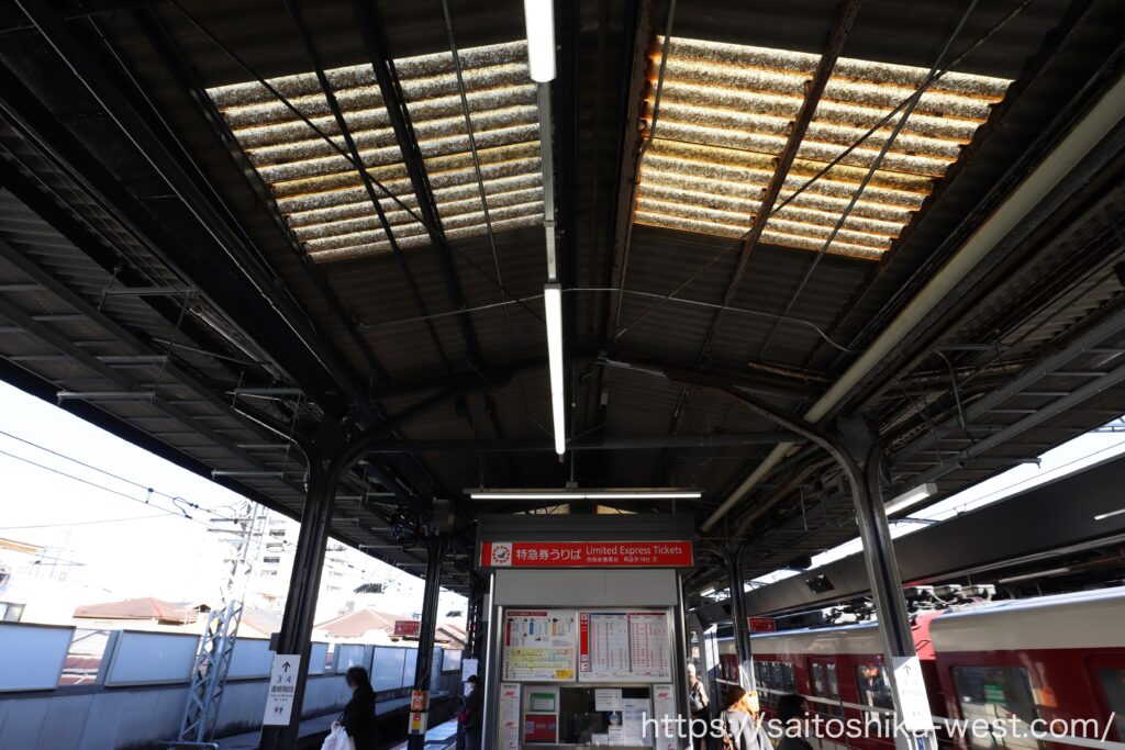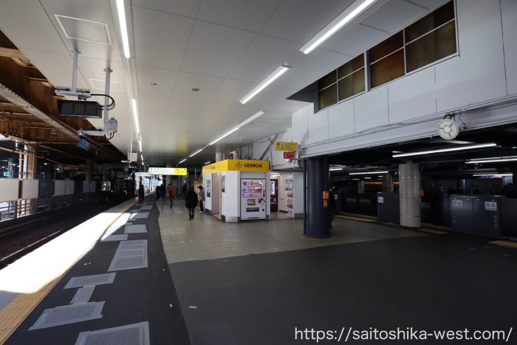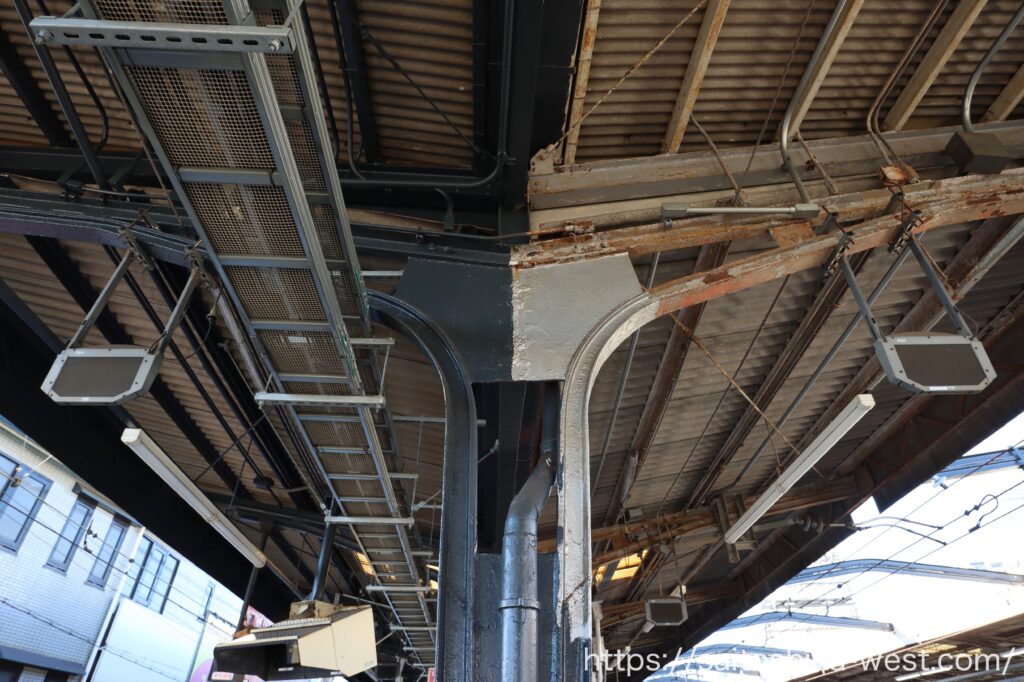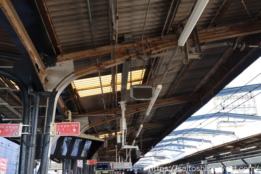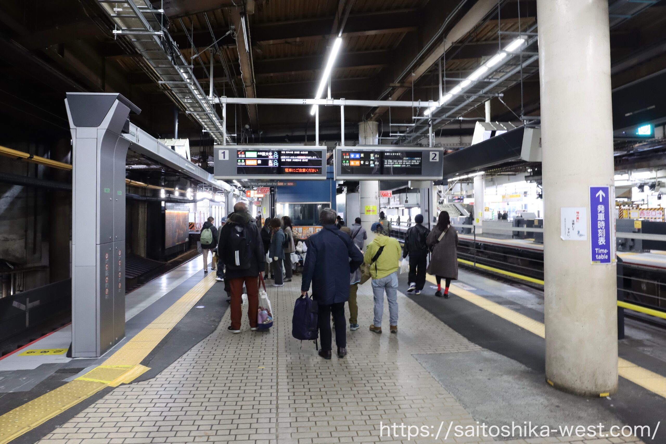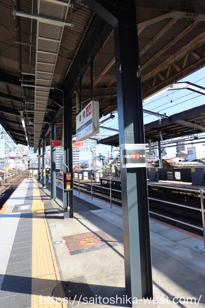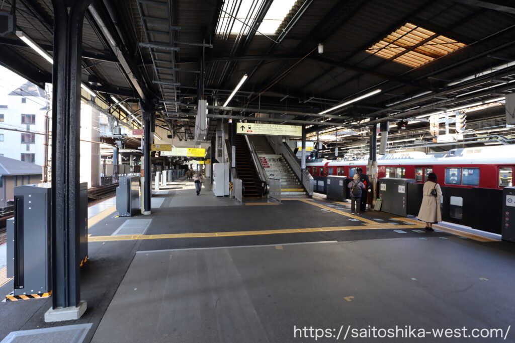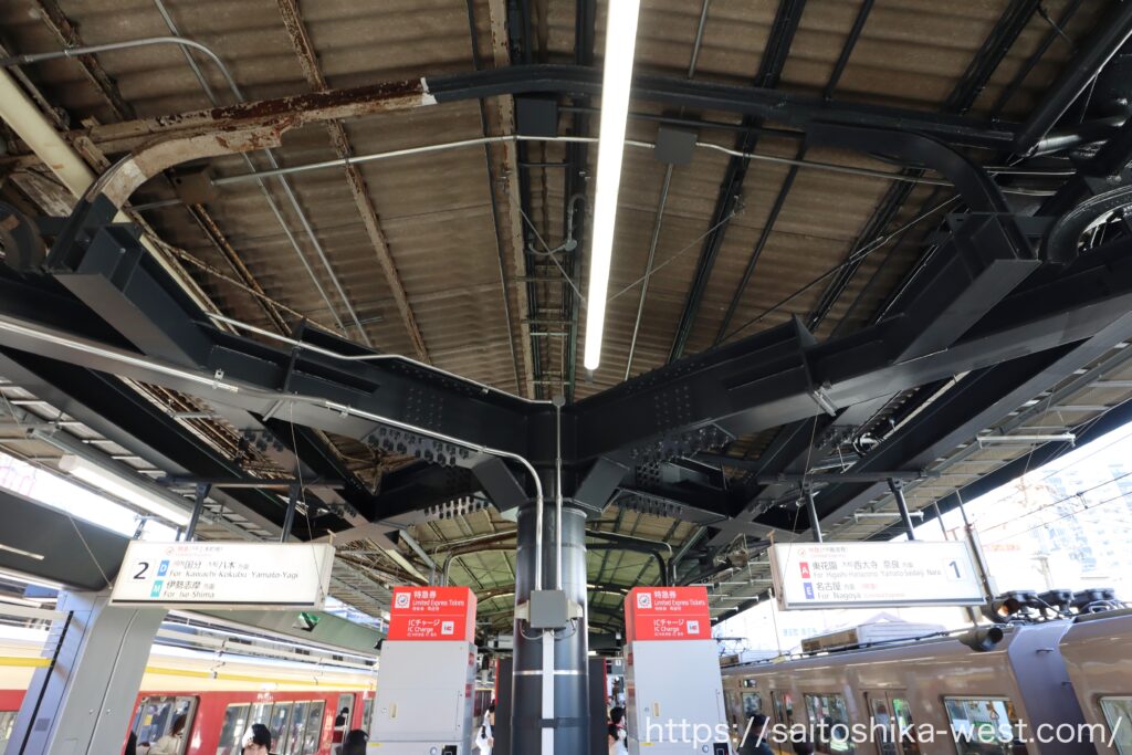 移動して、こちらは奈良・大和八木方面の1・2番線ホームの様子です。上屋を支える柱を減らすため、巨大な柱が設置され、ホーム際の柱の一部が置き換えられました。