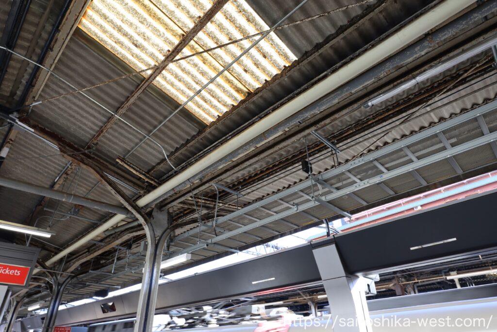 さらに環状線側へ移動しました。写真左が再塗装された箇所、右が未塗装です。天井の明かり窓も交換されており、綺麗ですね。