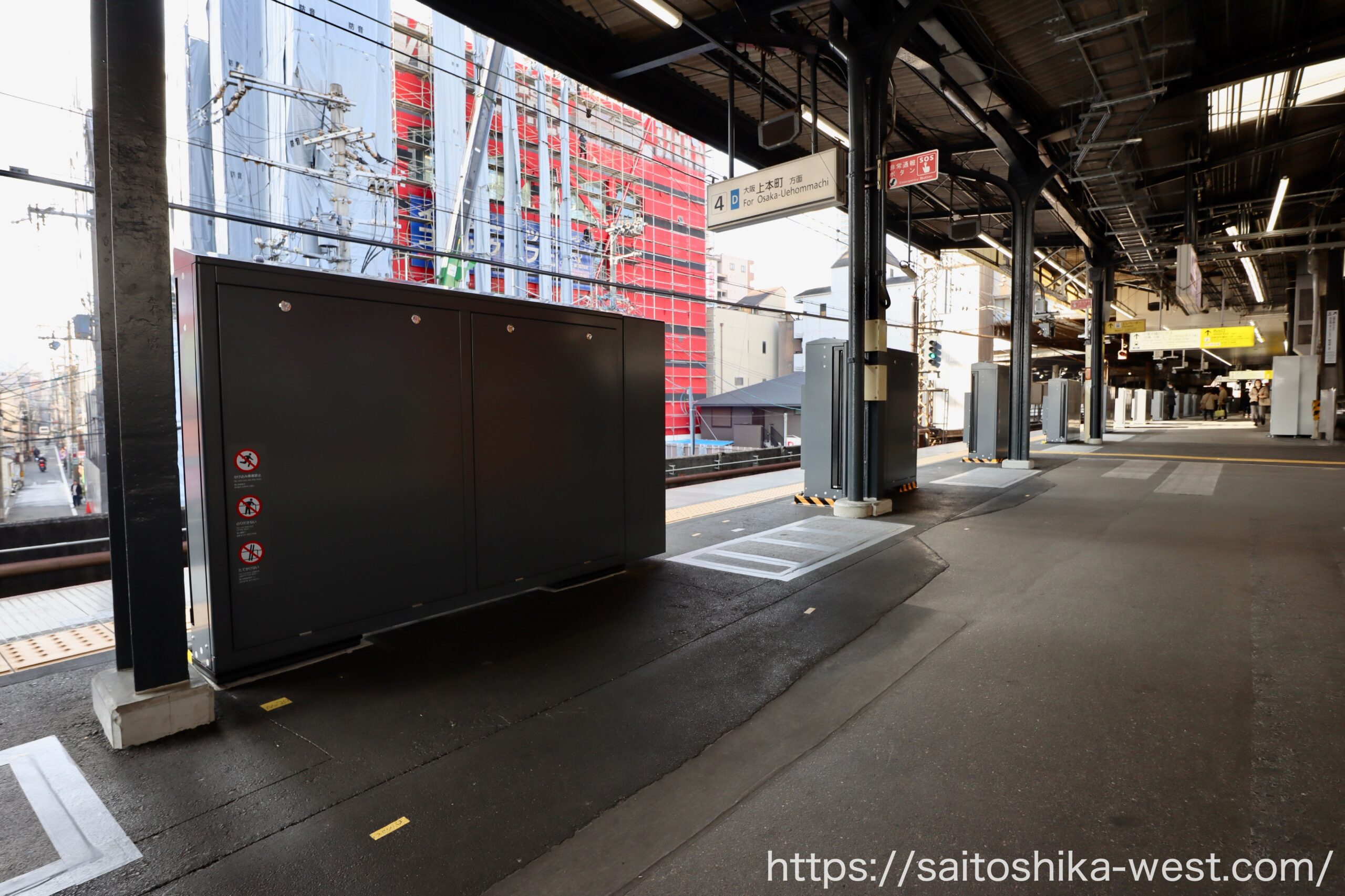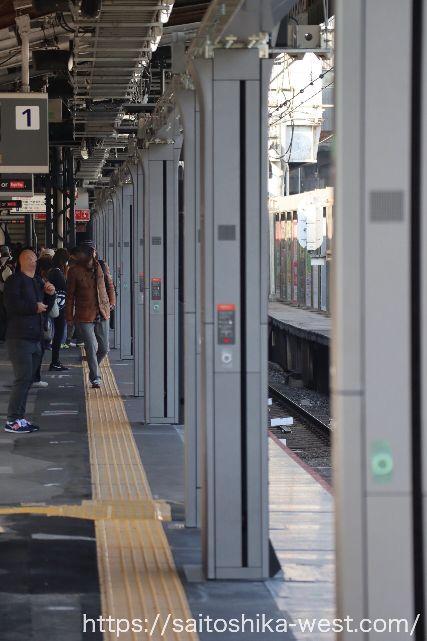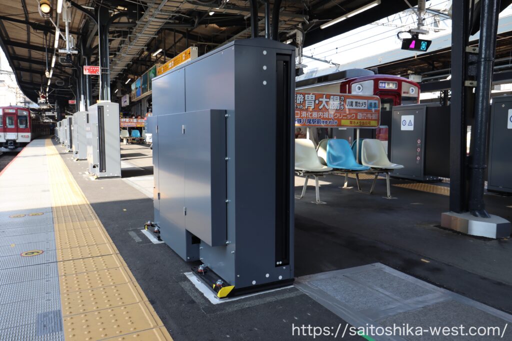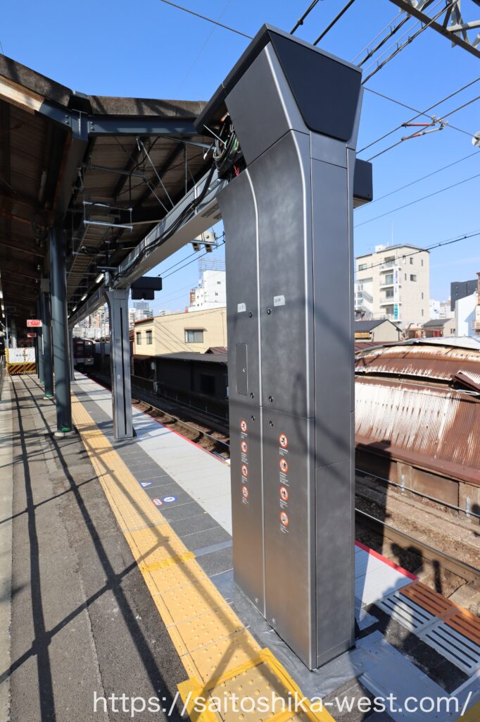 続いて、2026年3月(予定)の1番線(奈良方面)に設置される、昇降ロープ式ホーム柵の様子を見ていきます。