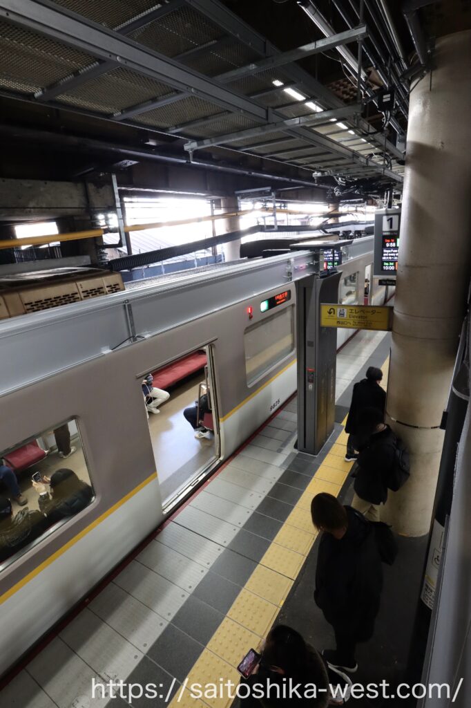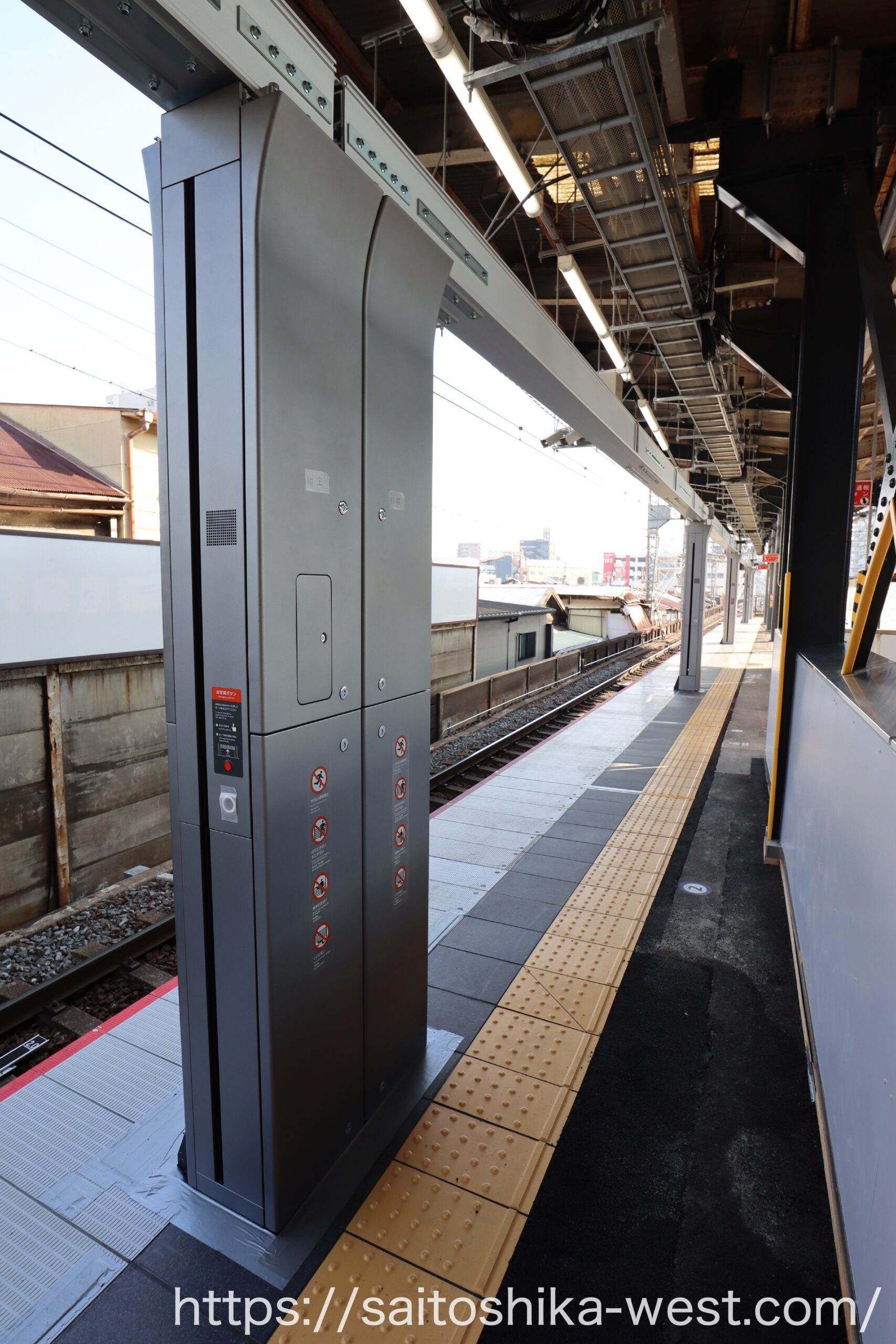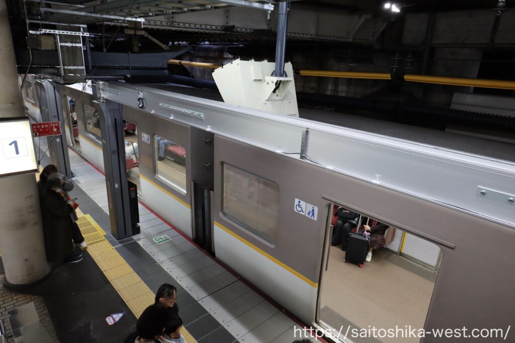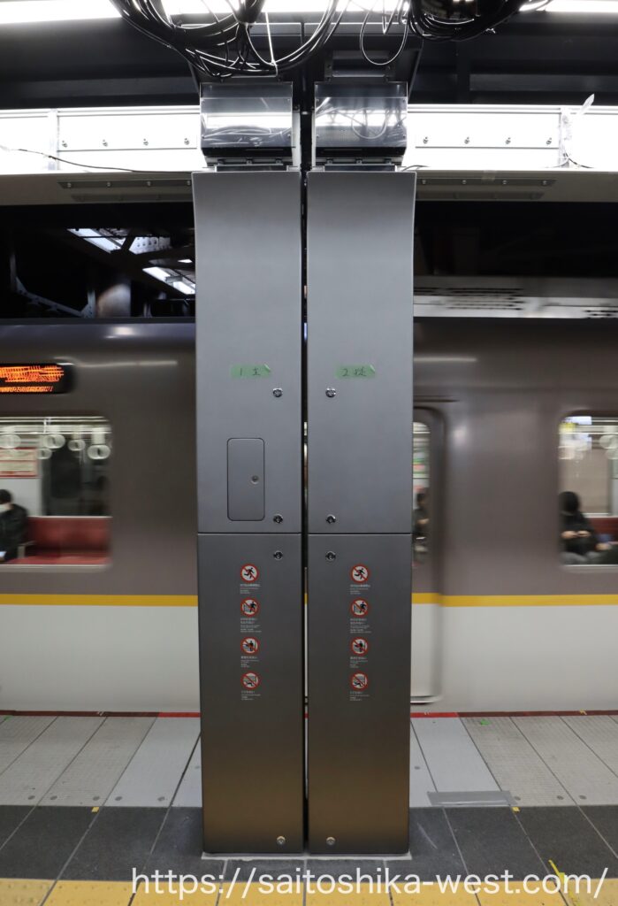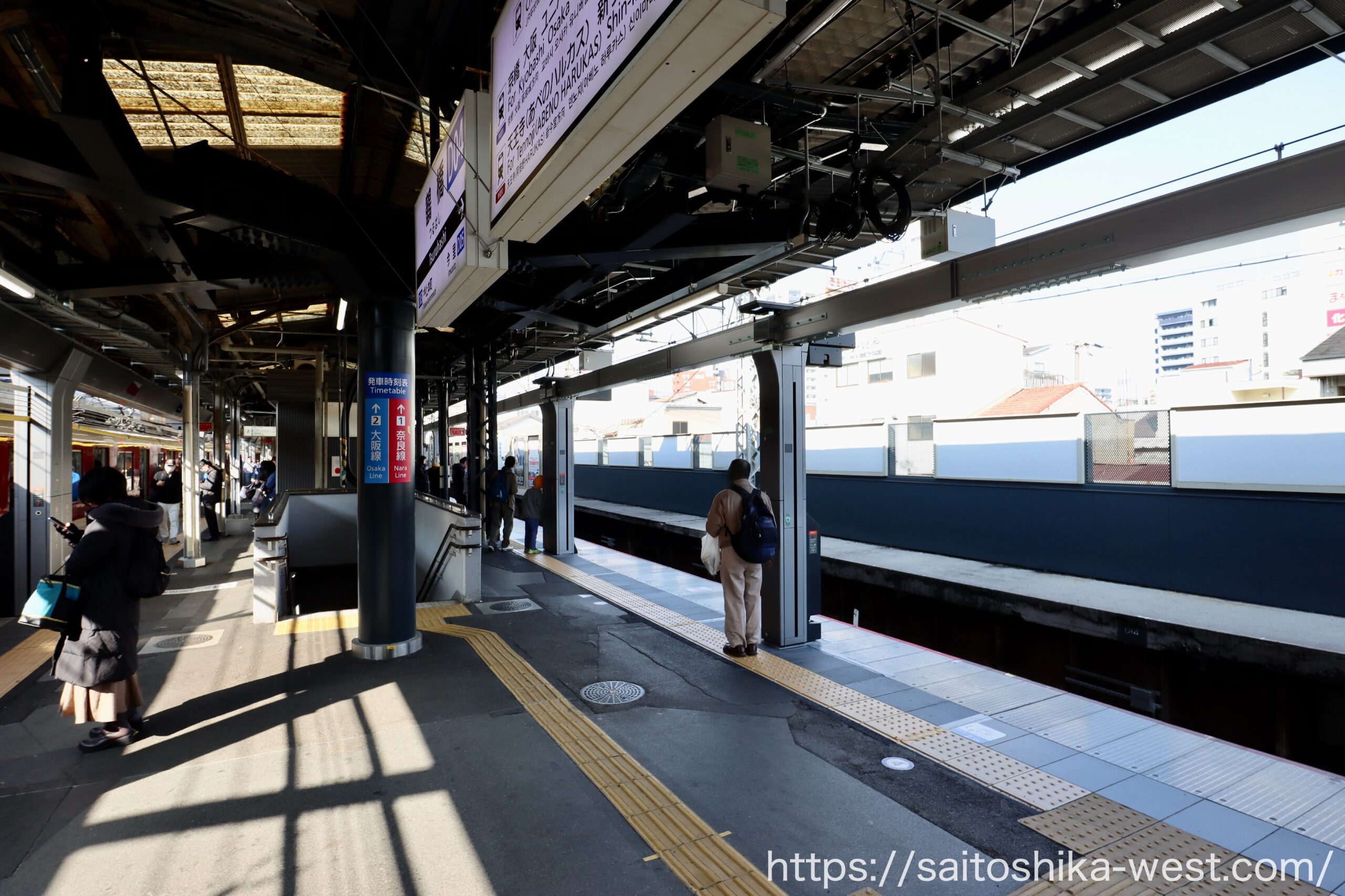 続いて、2026年3月(予定)の1番線(奈良方面)に設置される、昇降ロープ式ホーム柵の様子を見ていきます。