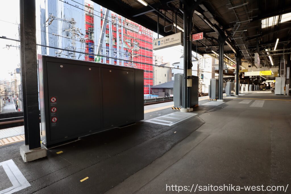 3・4番線ホームを環状線側に向かって移動していきます。4番線では、ホームドア(大開口ホーム柵)の設置準備工事が進んでいます。かなりホーム内側に設置される様子で、朝のラッシュ時の混雑がさらに激しくなりそうです。