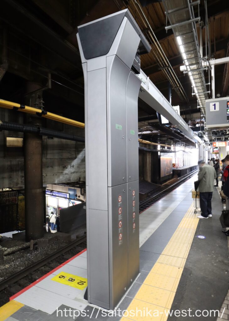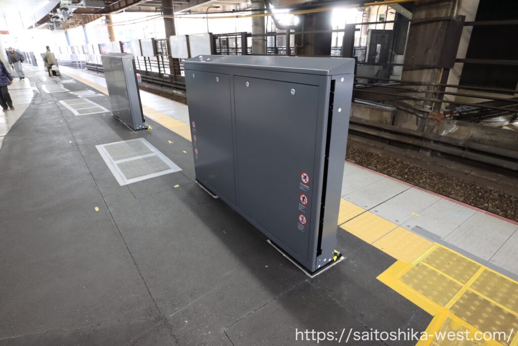 先に設置された3番線の大開口ホーム柵と同じく、線路からかなり離れた位置に設置されています。これは、ある程度ドア位置と開口部がずれていても、「この範囲内の開口部から通路に出てください」という、なかなか強引な設計です。ただ、すでに供用中の3番線のホーム柵が問題なく運用されていることから、今回も同じような運用になりそうです。