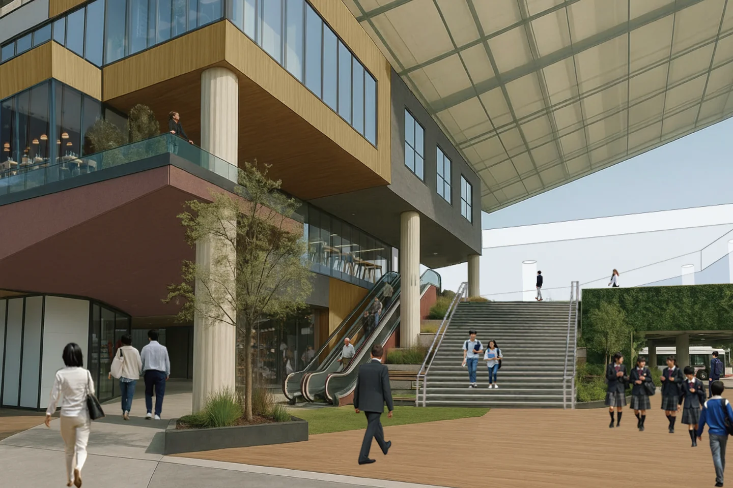 泉ケ丘駅前再整備の最大の特徴は、駅前南コンコースを起点に、歩行者の主動線を2階レベルへ引き上げる点にあります。