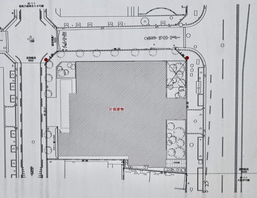 現地の様子です。計画地は旧・関西将棋会館のなにわ筋線を挟んだ向かい側で、以前はファミリーマートやコインパーキングがあった場所です。