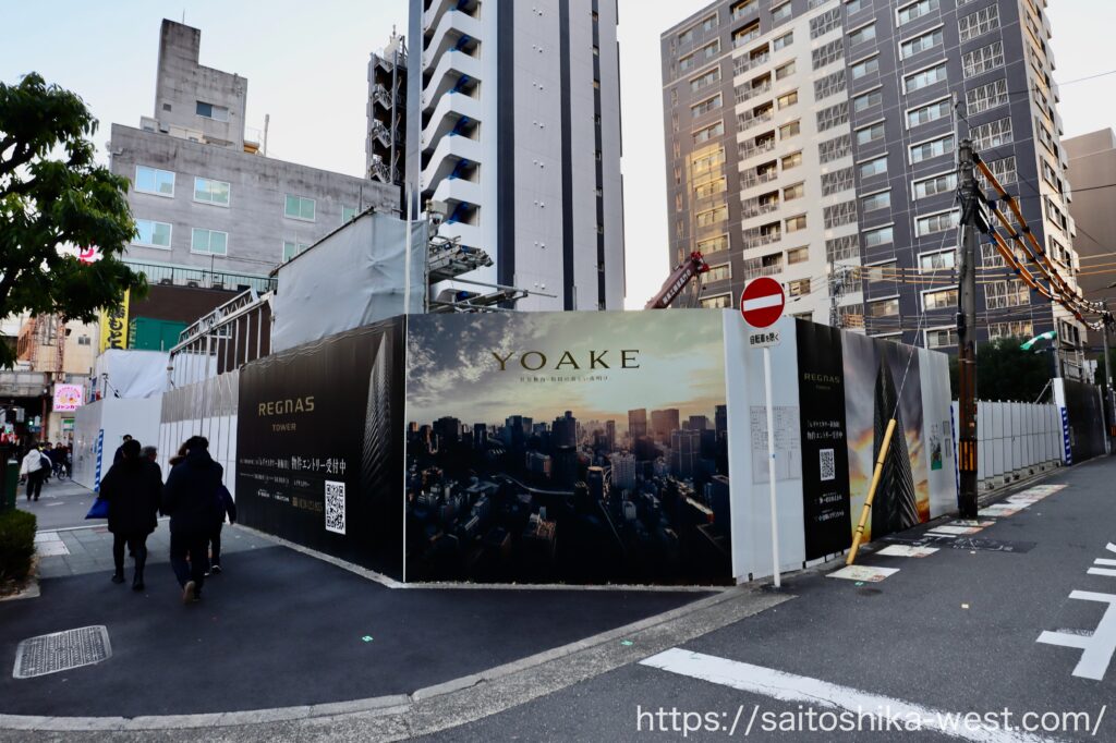 真正面から見た様子です。敷地面積は1,056.46㎡で、それほど広くありません。以前ここにあったファミリーマートは何度か利用したことがありますが、この場所にタワーマンションが建つとは、当時は想像もしていませんでした。