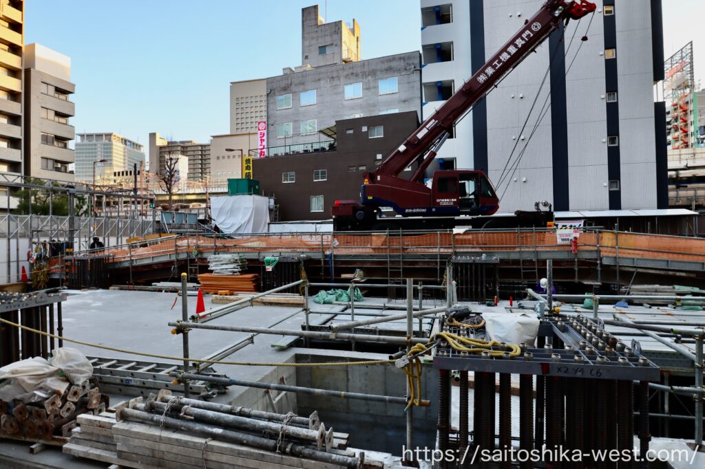 最後は、ハイアングルから見た内部の様子です。取材時点では、タワークレーンの組み立てが始まる直前の段階でしたが、現在はすでにクレーンが立ち上がっているものと思われます。