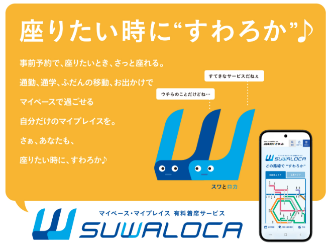 新ブランド名の「SUWALOCA(すわろか)」は、「座る(すわる)」と「ローカル」を掛け合わせた名称です。コンセプトには「マイペース・マイプレイス」を掲げ、自分のペースで移動し、自分の居場所を確保できる移動体験の提供を目指しています。これまでの有料着席サービスは、列車や区間ごとに名称や仕組みが異なり、違いが分かりにくいという課題がありました。今回のブランド統一により、有料着席サービス全体を一つの枠組みとして理解できる状態を整えます。