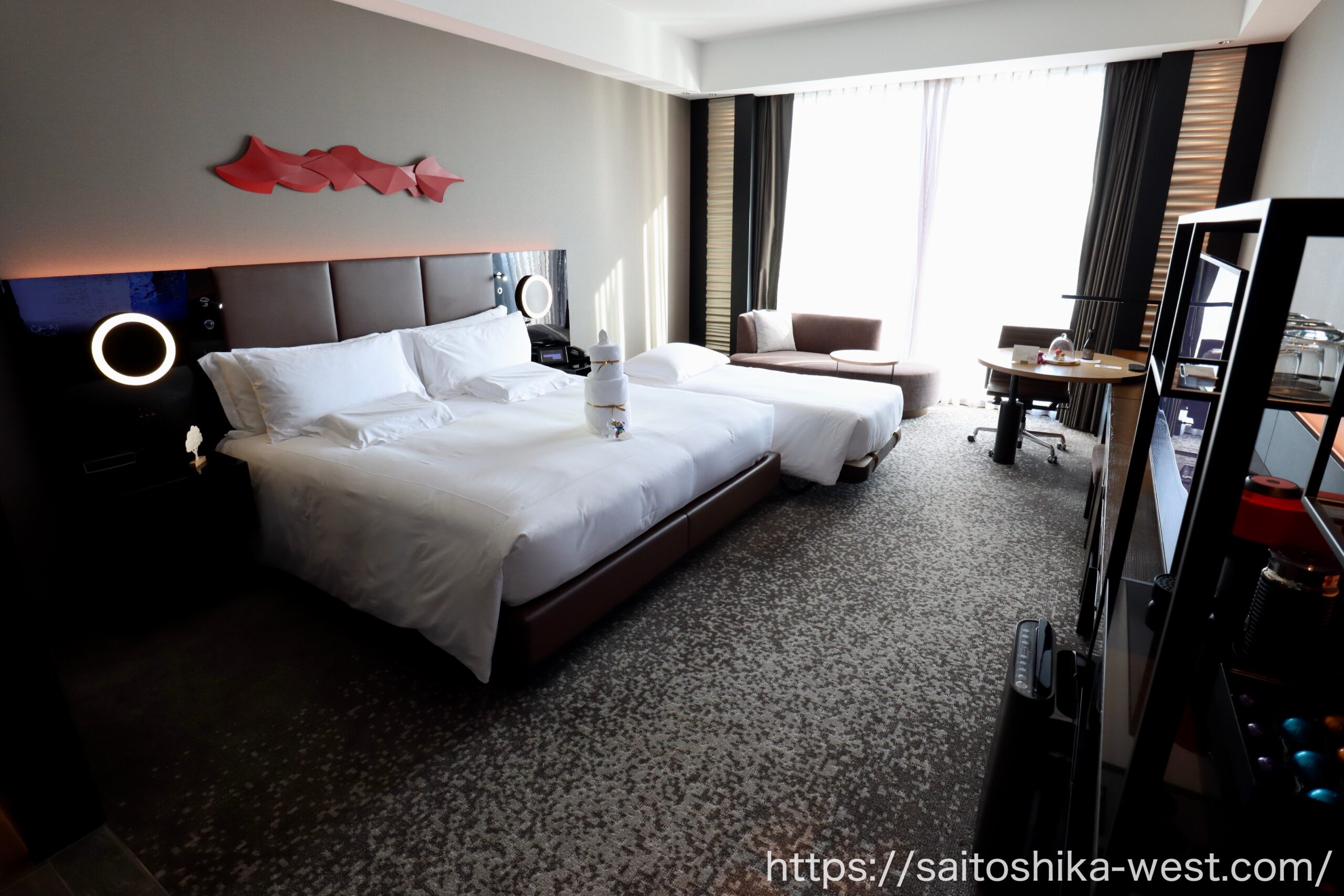 全体としては、昨年開業したウォルドーフ・アストリア大阪を想起させる、木質素材を多用した和のテイストを感じさせる落ち着いたデザインとなっており、正統派ラグジュアリーホテルとして非常に完成度の高い仕上がりが期待されます。