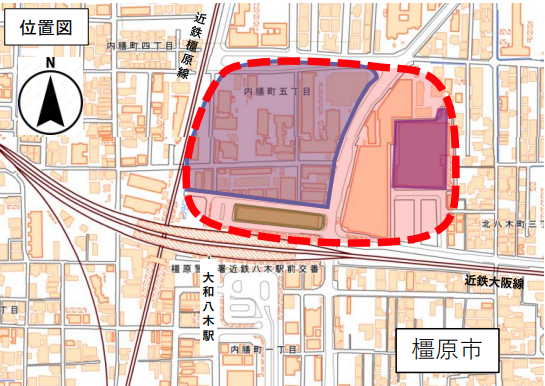 駅北側は、近鉄大阪線と橿原線が交差する交通結節点で、県内でも利便性の高いエリアと位置づけられています。一方で、駅前としての将来像が十分に整理されていないことが課題とされてきました。