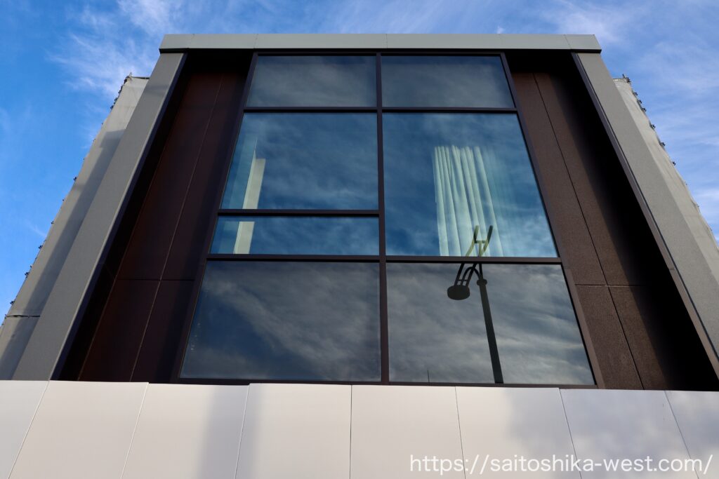 移動中に、新ホテルの外壁の実物大模型「モックアップ」を発見しました。パーク側の客室階のデザインを再現したものです。