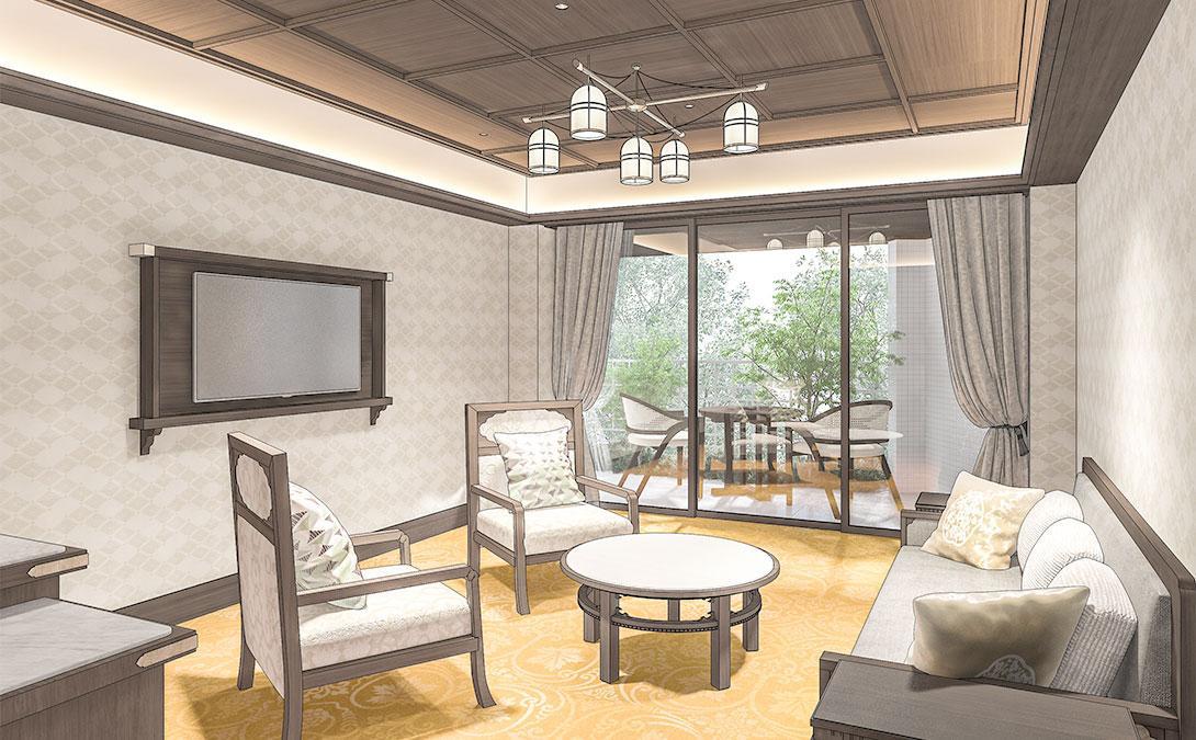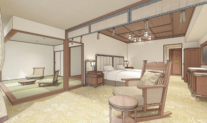 西館の客室は緑豊かな中庭に面した設計とされ、非日常感のある落ち着いた滞在が意識されています。リリースに掲載された完成イメージでは、63.1㎡の「プレミアムテラスツイン」、63.9㎡の「プレミアム和洋室」、67.5㎡の「クラウンスイート」などが示されており、従来よりもゆったりとした高付加価値型の客室構成であることが分かります。