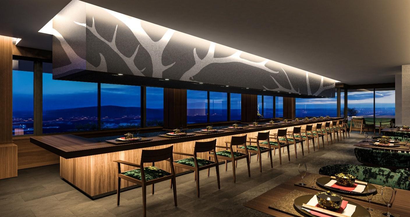 料飲部門では、日本料理「花菊」が鉄板焼「花菊」として新たにオープンします。奈良町を望む眺望と落ち着いた空間を活かし、地元食材をふんだんに使用した料理を、臨場感のある鉄板焼スタイルで提供する計画です。完成イメージでは、横一列のカウンター席から眺望を楽しめる構成となっており、従来の日本料理店とは異なる、より体験型・高単価型の業態への刷新が見て取れます。