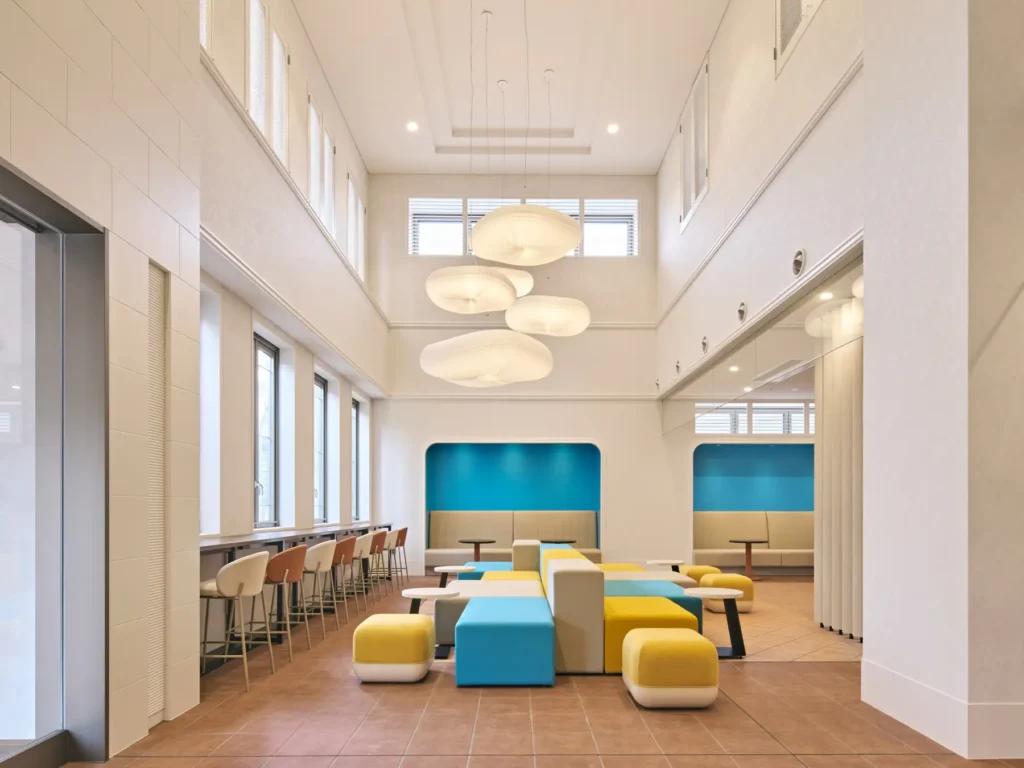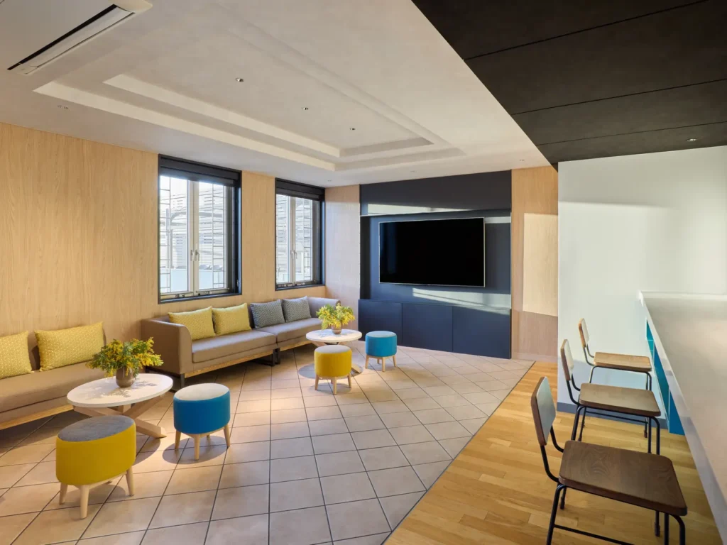 館内は温かみのある色調とやわらかな素材感を取り入れた内装で、大阪の街から着想を得たアートワークも随所に配置されています。ロビーは天井が高く開放感のある作りで、街歩き後の休憩・仕事・他のゲストとの交流など、多目的に使える共用スペースが複数設けられています。