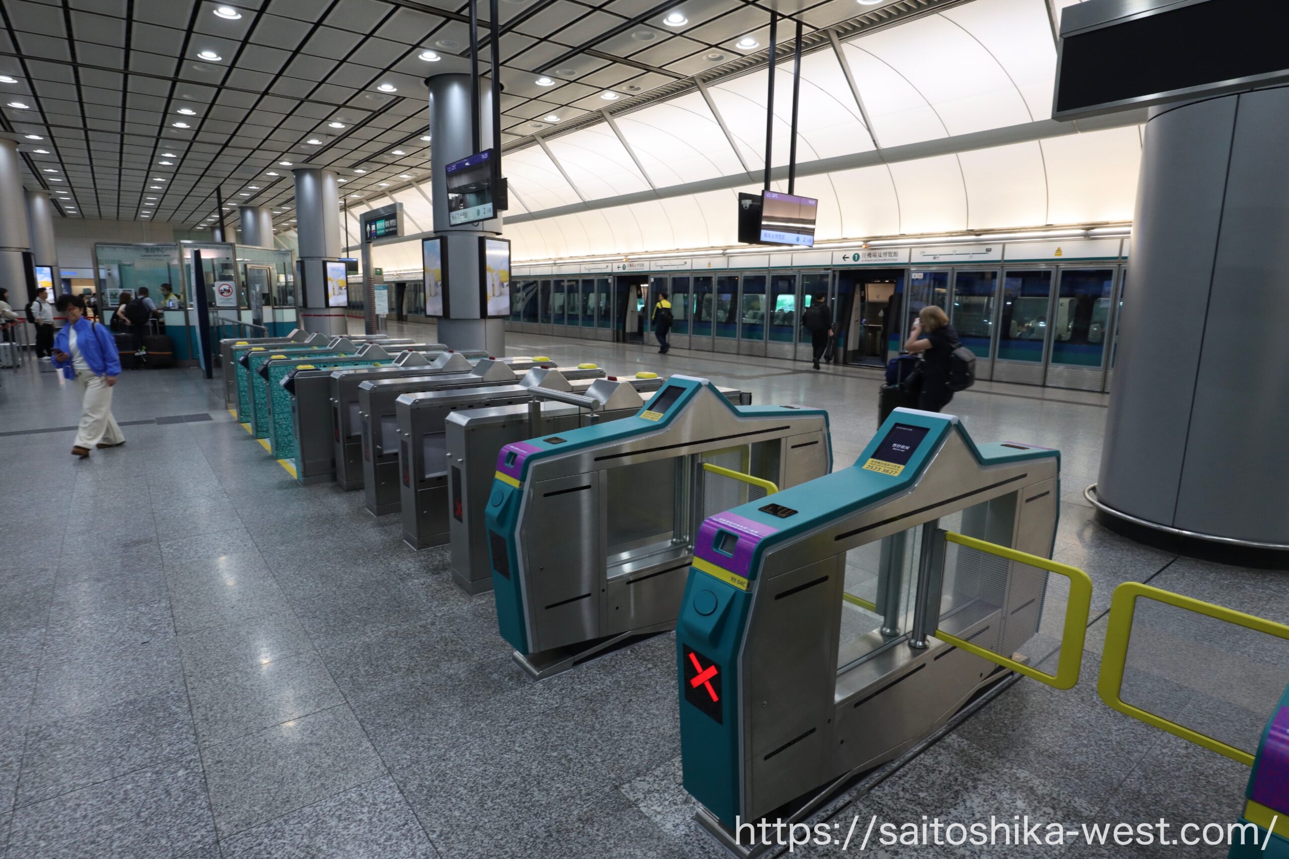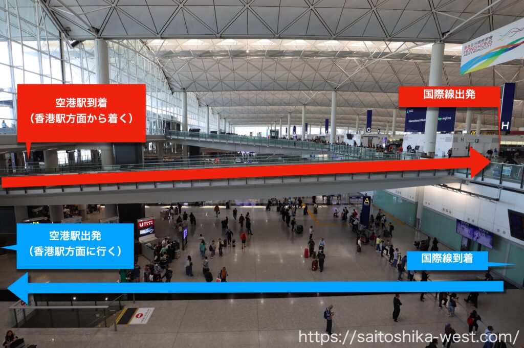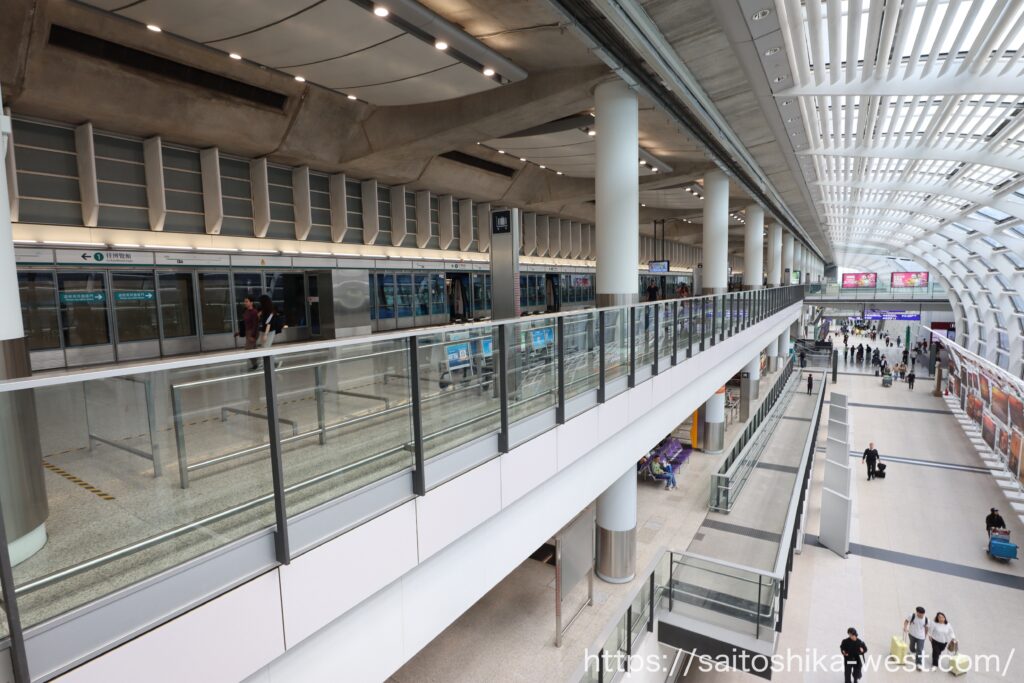 電車の乗り場が上下二層構造になっており、国際線到着→香港駅、香港駅→国際線出発がそれぞれフラットな動線で接続されています。これは本当にすごい。チケットは窓口や券売機、オンラインで購入でき、オンライン購入分はQRコードで利用できます。空港側で細かな判断を何度も求められず、自然にホームまでたどり着ける。この段階で、空港アクセス鉄道としての設計のうまさを感じました。