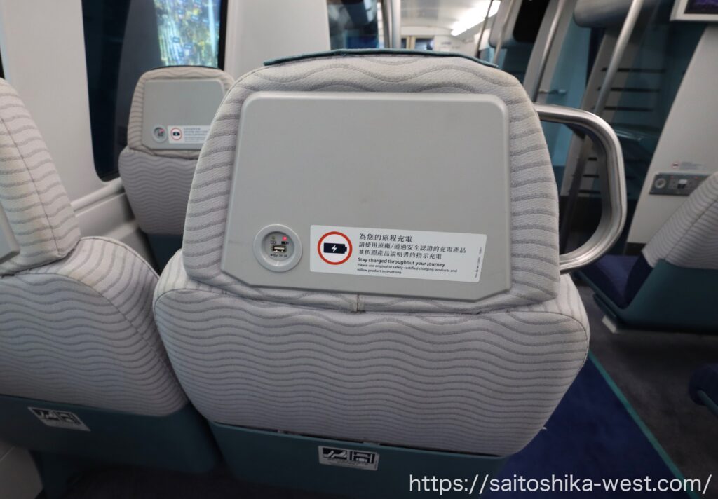 ただ、座席背面にはUSB給電ポートがあり、座面のクッション性も良く、腰まわりをしっかり支えるつくりです。固定席とは思えないほど座り心地が良いく、短時間の空港アクセス列車としては十分に快適でした。