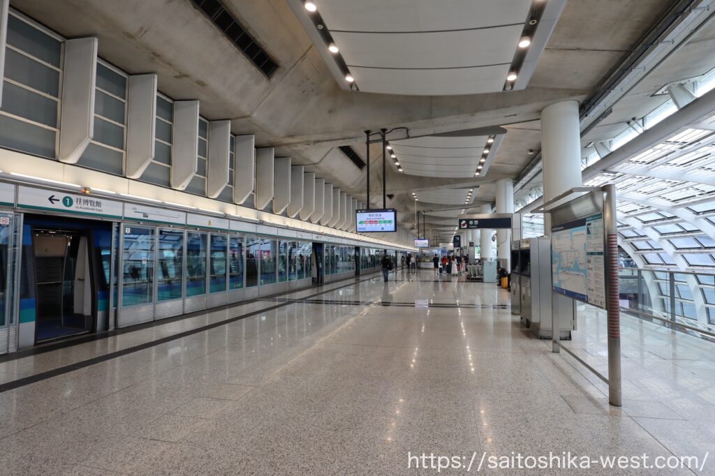 さらに驚いたのが、空港駅に「改札口がない」ことです。チケットのチェックは香港市内側でのみ行われ、空港利用者は電車を乗り降りする際、そのままフリーで香港市内やチェックインカウンターに向かうことができます。これは、エアポート・エクスプレス線が空港利用者に特化して施設整備された成果です。