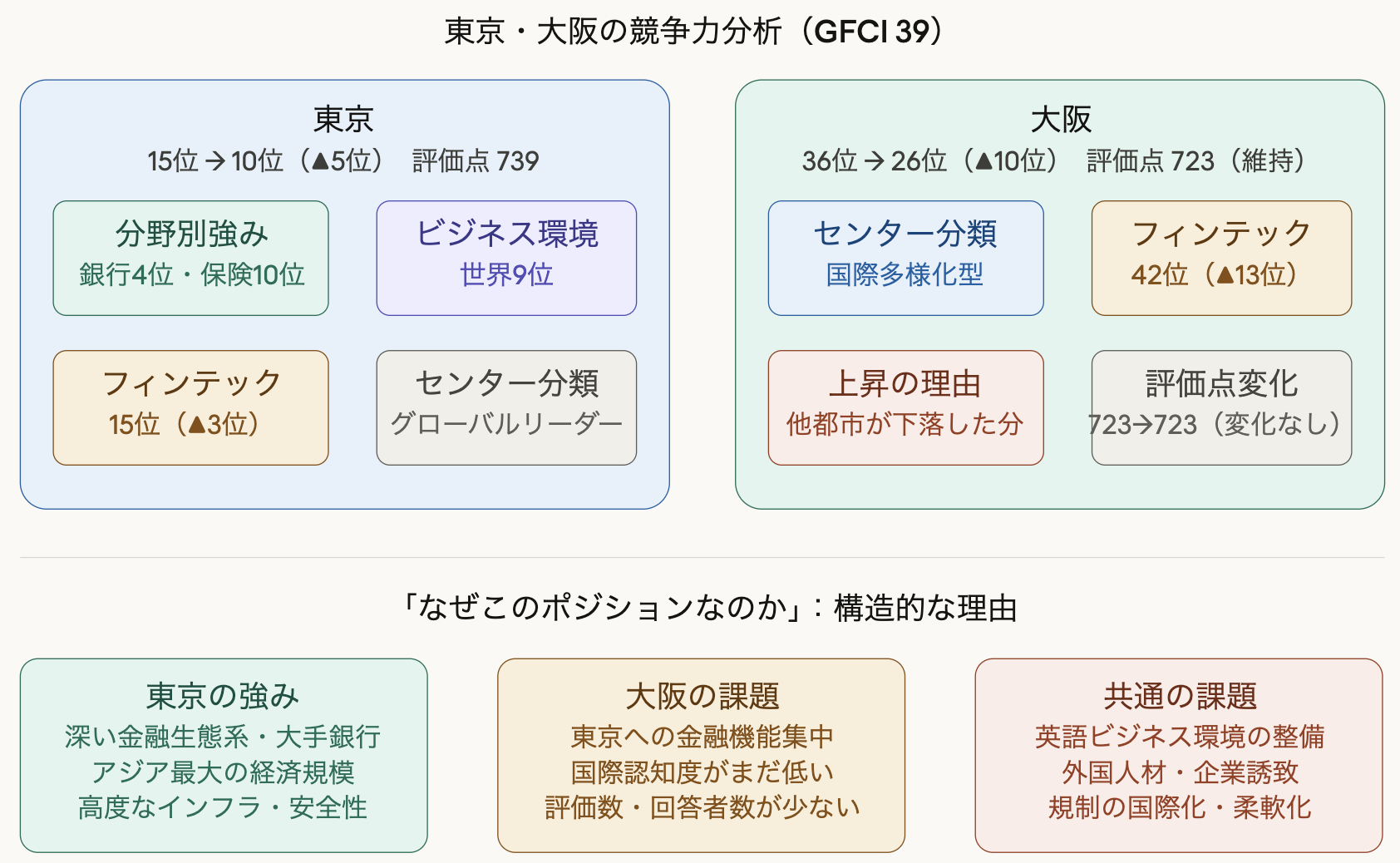 この流れの中で見ると、東京のトップ10復帰はかなりわかりやすい動きです。東京はGFCI 39で10位、評価点739でした。前回15位から5ランク上昇していますが、評価点自体は744から739へ5ポイント下がっています。つまり東京は「急成長した」のではなく、他都市の下落幅がより大きかったため、相対的に順位を戻した面が強いということです。