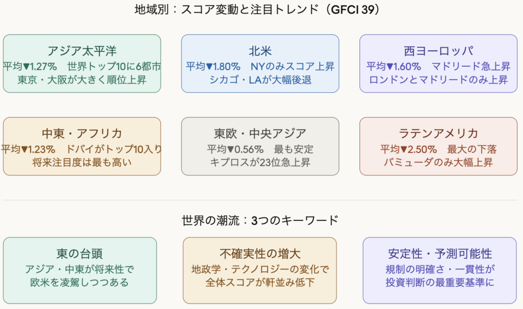 今回のポイントは、順位の上げ下げをそのまま「成長」や「後退」と見ないことです。GFCI 39では、ほぼすべての金融センターで評価点が下がりました。全体平均は前回比で1.82%低下し、地域別ではラテンアメリカ・カリブ海が2.5%低下と最も大きく、東欧・中央アジアは0.56%低下と最も小幅でした。レポートはこれを、個別都市の問題ではなく、地政学的な複雑化、経済構造の変化、技術変化を背景とする「世界的な認識変化」と整理しています。今回は「どこが大きく伸びたか」というより、「どこが下落局面でも持ちこたえたか」を見る回でした。