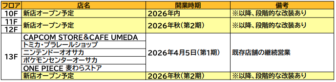10階〜13階に整備される「LUCUA キャラクターズワールド」は、将来的に国内最大級のキャラクターゾーンを目指す計画です。ただし、第1期で営業を開始したのは13階の既存5店舗のみです。対象となるのは、「CAPCOM STORE&CAFE UMEDA」「トミカ・プラレールショップ」「ニンテンドーオオサカ」「ポケモンセンターオーサカ」「ONE PIECE 麦わらストア」です。いずれも既存店舗の継続営業となります。