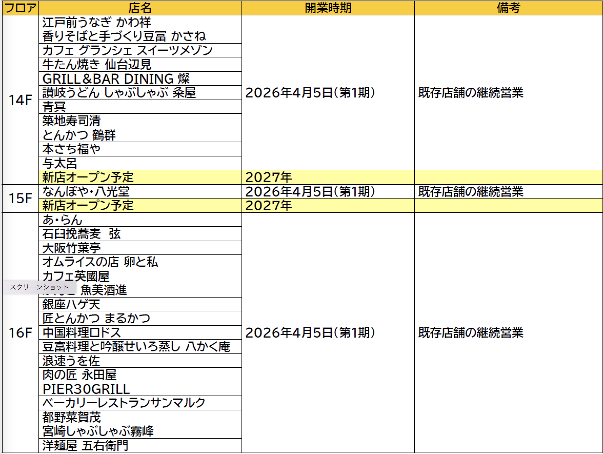 4月5日の開業は、あくまで第1期としてのスタートです。この時点で営業を始めたのは13階〜16階で、既存34店舗が継続営業という形でオープンしました。全面開業ではなく、既存の集客力を持つ店舗を活かしながら、段階的に新館全体を立ち上げていくスケジュールとなっています。