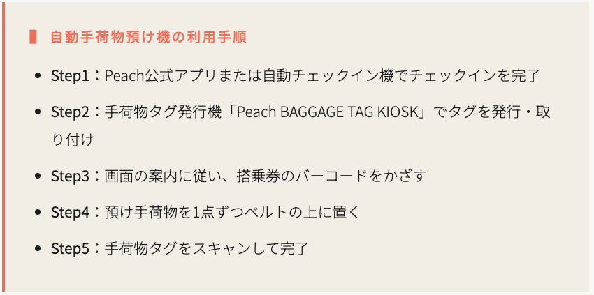 利用手順は、Peach公式アプリまたは自動チェックイン機でチェックインを行い、「Peach BAGGAGE TAG KIOSK」でタグを発行して荷物に取り付けた後、自動手荷物預け機で搭乗券のバーコードをかざし、手荷物を1点ずつベルトに載せ、最後にタグをスキャンして完了する流れです。チェックインから預け入れまでをセルフで完結しやすくしたことで、ピーク時のカウンター混雑抑制にもつながりそうです。